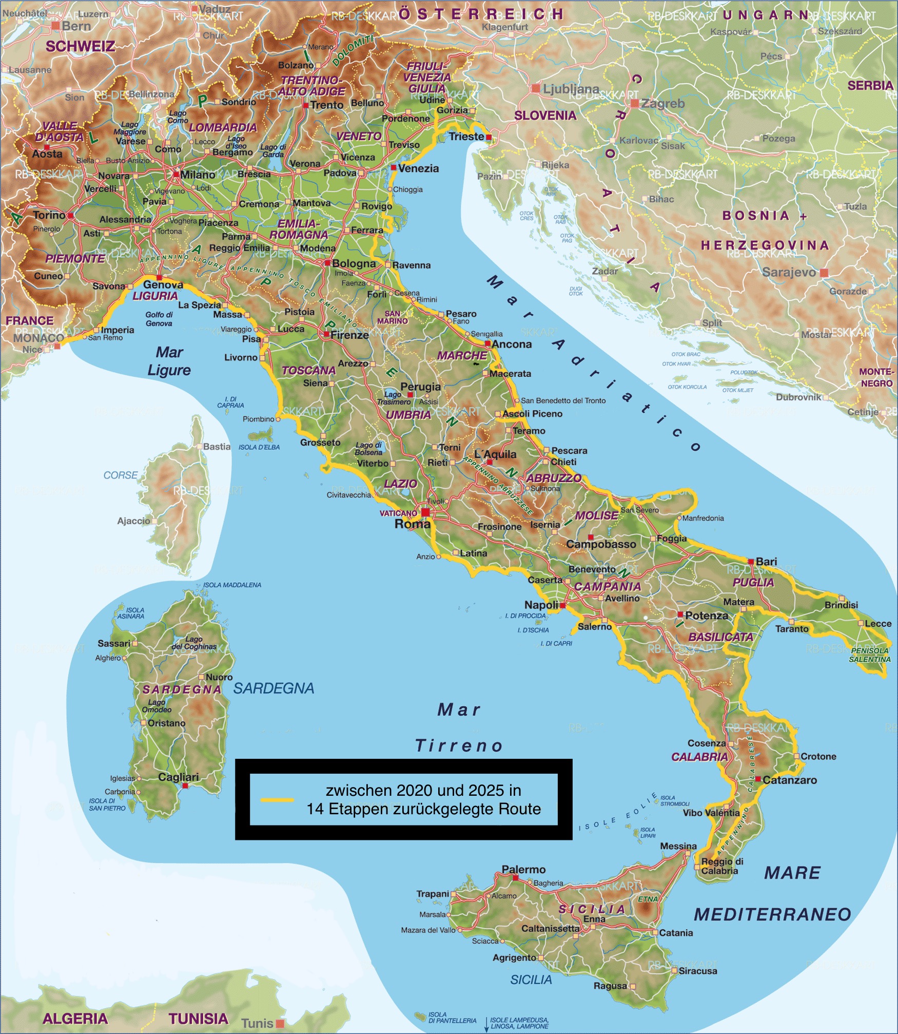 Mein Ziel ist es, mit dem Rad den gesamten Stiefel im Uhrzeigersinn mehr oder weniger der Küste entlang abzufahren, also von Triest im Nordosten über Venedig, Ancona, Pescara, Brindisi, Santa Maria di Leuca, Reggio di Calabria, Neapel, Rom, Livorno, Genua bis Ventimiglia an der Grenze zu Frankreich. Allerdings nicht durchgehend in einer Radreise, sondern in Etappen von ein paar Tagen. Im Süden werden es wohl längere Teilstrecken werden, für die ich mir dann auch mehr Zeit nehmen werde.