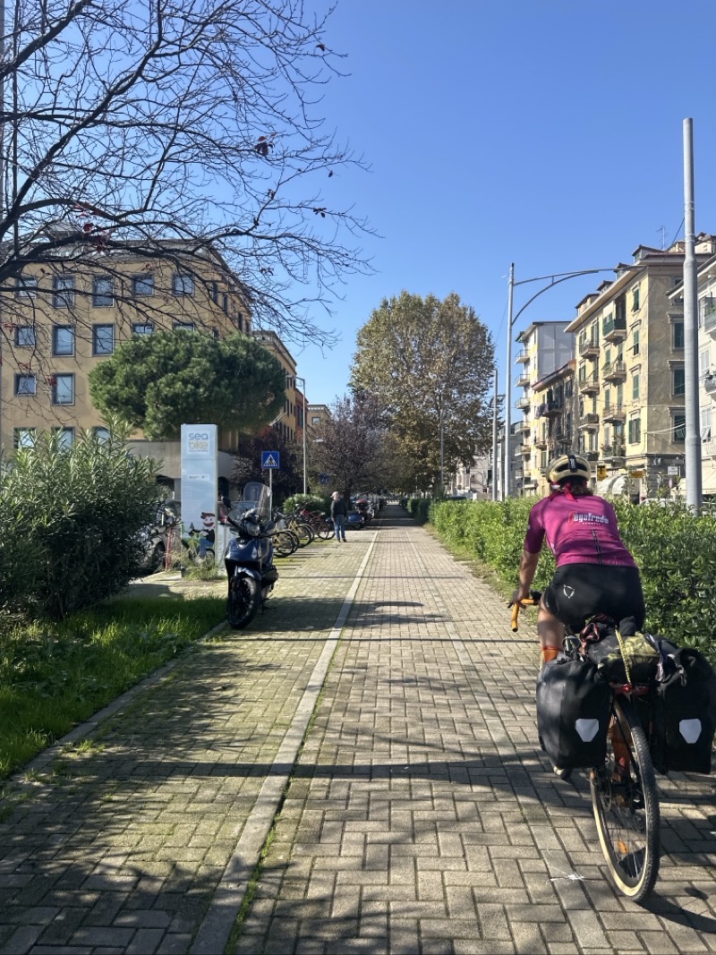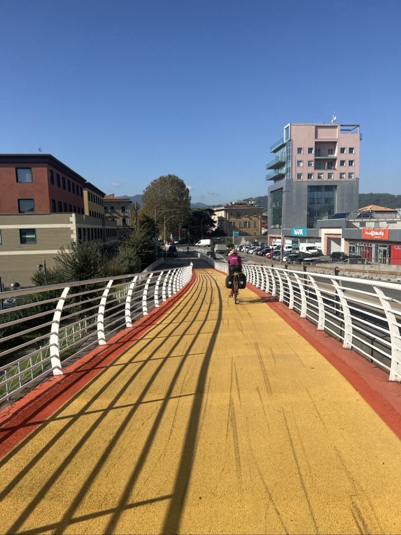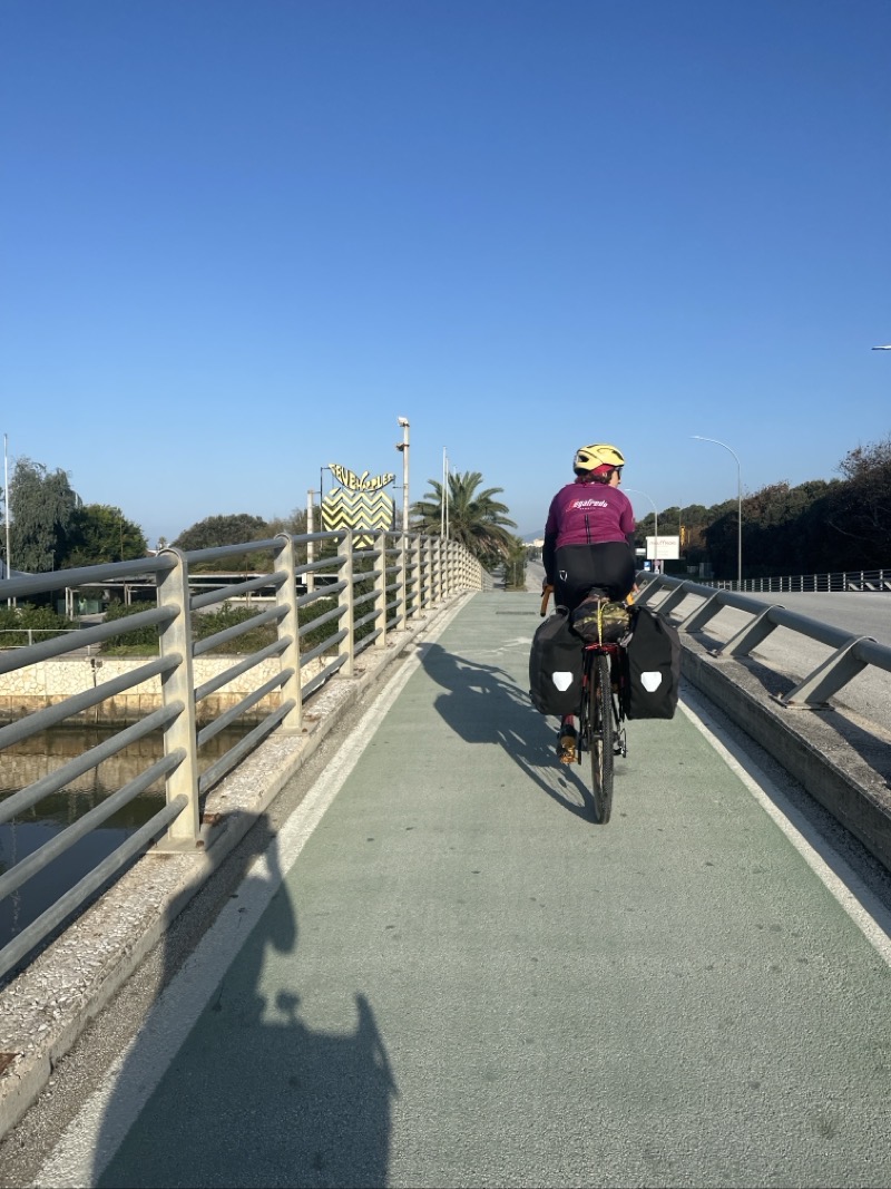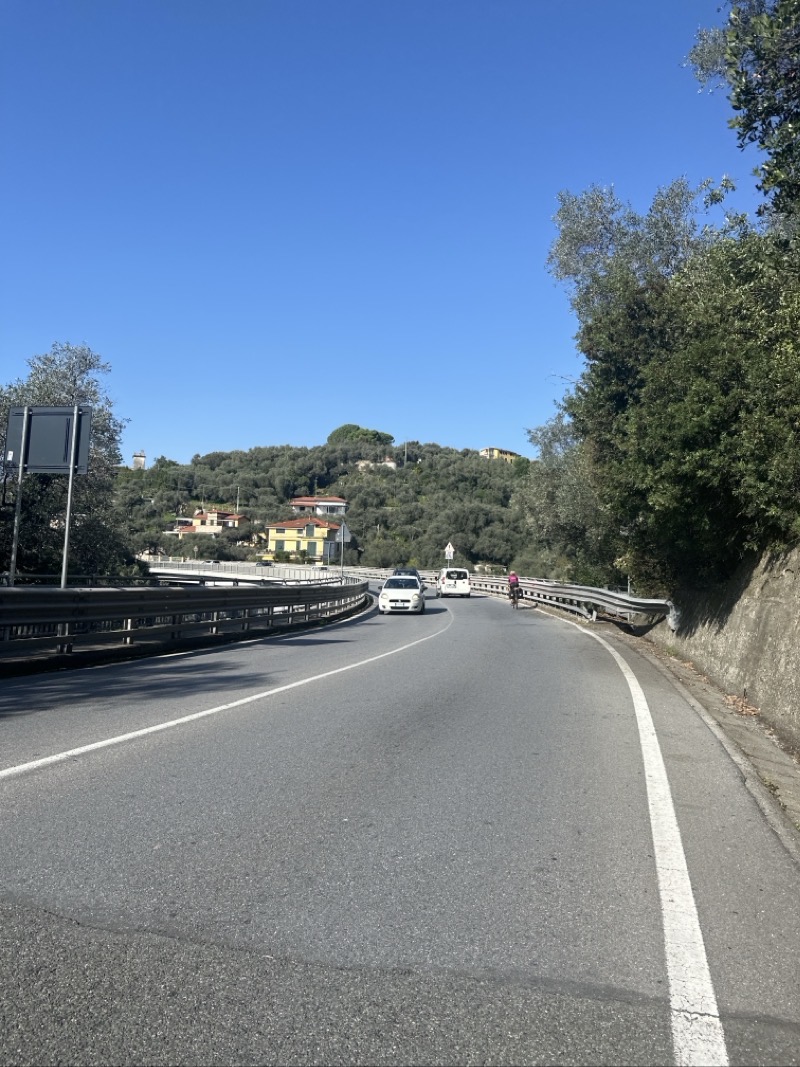 An der Viale Amerigo Vespucci verfehlen wir den rechts neben der Straße gelegene Radweg und fahren stattdessen bis Marina di Massa auf der Straße… Auch bei Avenza hätten wir den Radweg nehmen können… Naja, zum Trost sind auch andere Rennradfahrer hier unterwegs und es herrscht nur schwacher Verkehr. Der Torrente Parmignola westlich von Avenza stellt die Grenze zwischen der Toskana und Ligurien dar. Benvenute in LIGURIA!!!