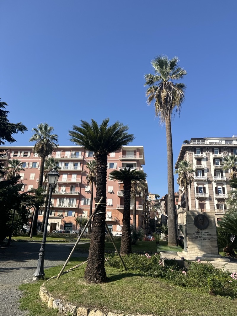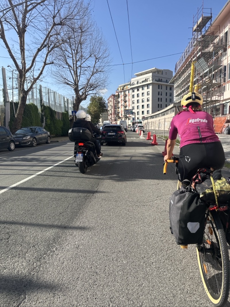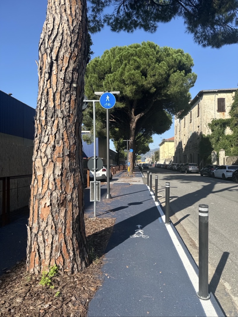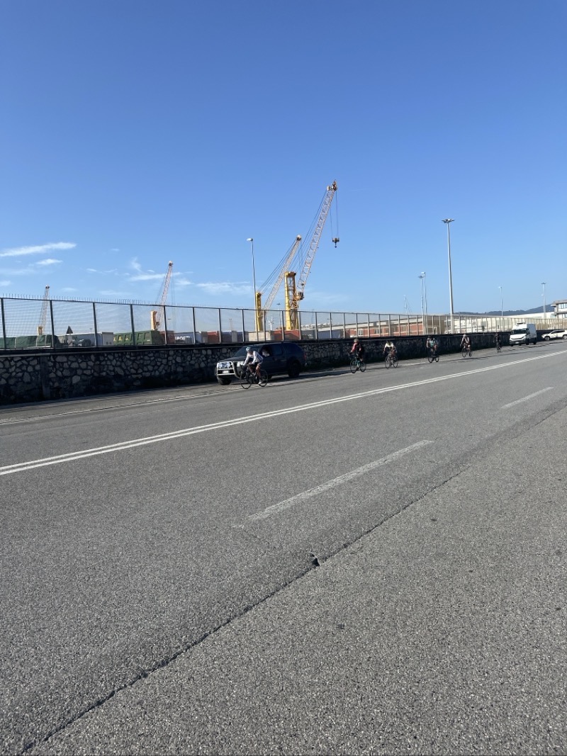 An der Viale Amerigo Vespucci verfehlen wir den rechts neben der Straße gelegene Radweg und fahren stattdessen bis Marina di Massa auf der Straße… Auch bei Avenza hätten wir den Radweg nehmen können… Naja, zum Trost sind auch andere Rennradfahrer hier unterwegs und es herrscht nur schwacher Verkehr. Der Torrente Parmignola westlich von Avenza stellt die Grenze zwischen der Toskana und Ligurien dar. Benvenute in LIGURIA!!!