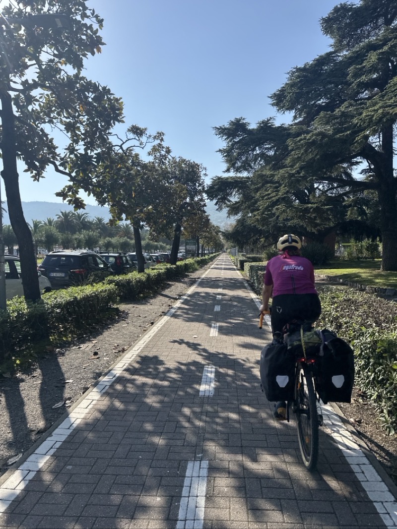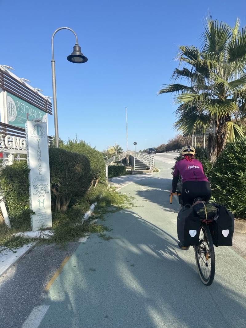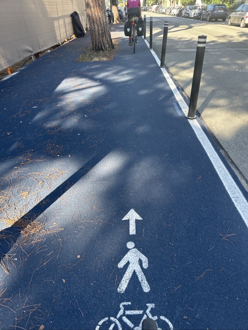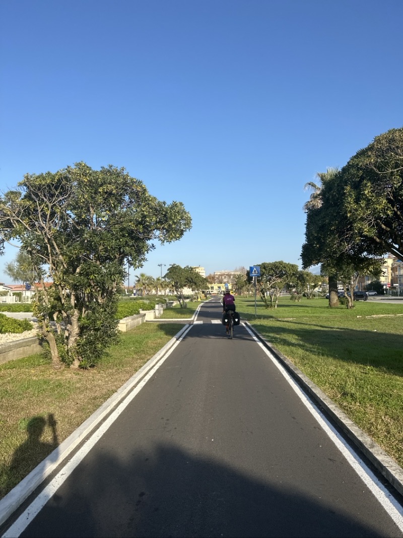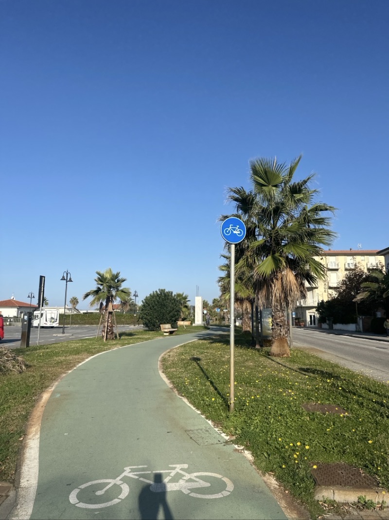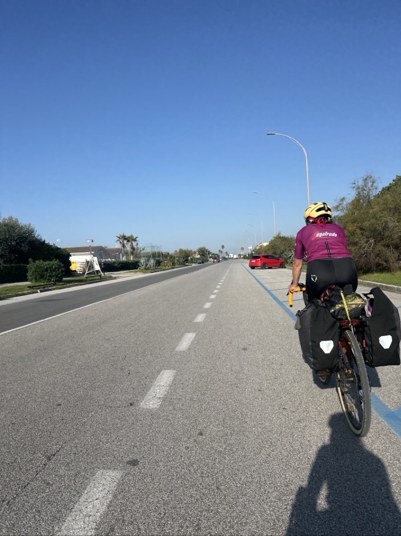 Der Radweg bei Roma Imperiale, wo der Zugang zum Meer durch Privatbesitz hauptsächlich versperrt ist.