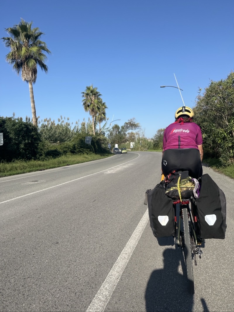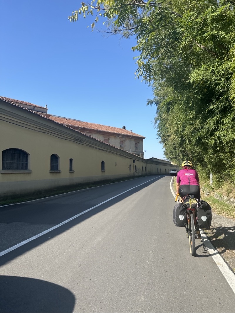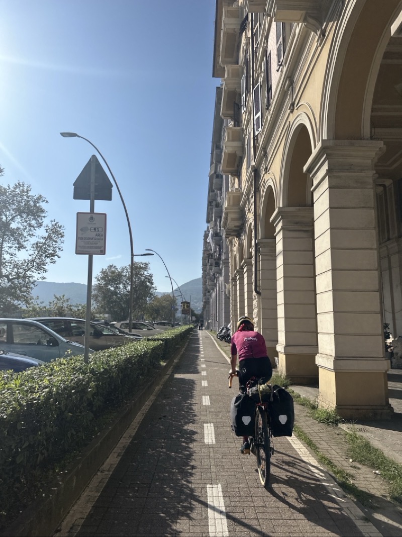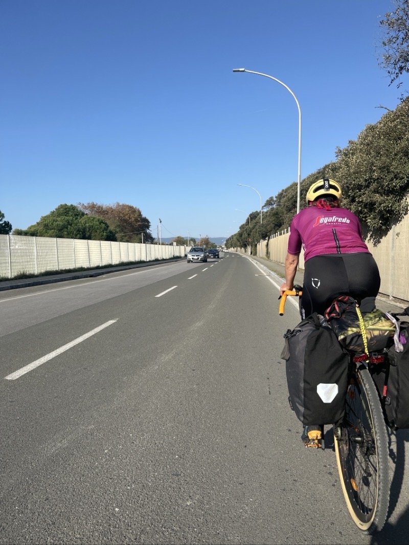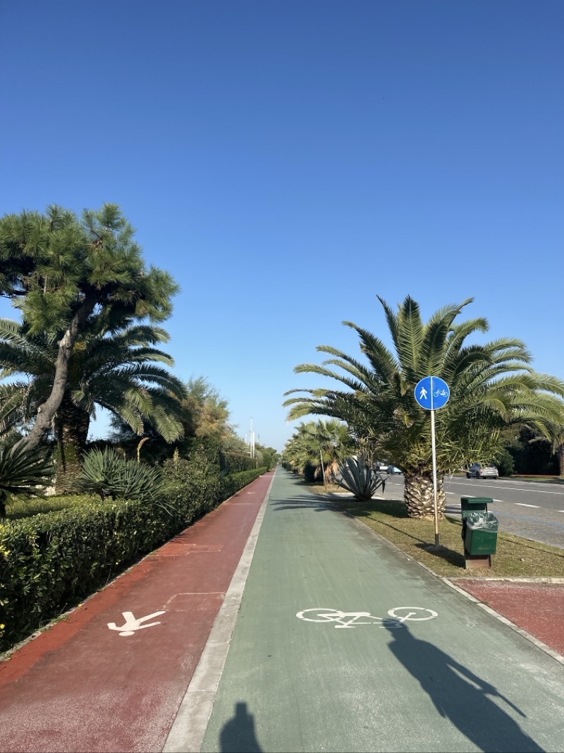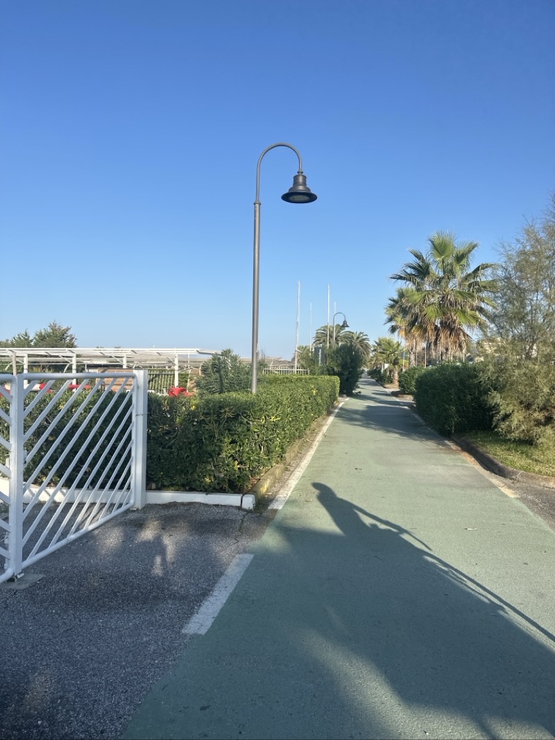 Der Radweg bei Roma Imperiale, wo der Zugang zum Meer durch Privatbesitz hauptsächlich versperrt ist.