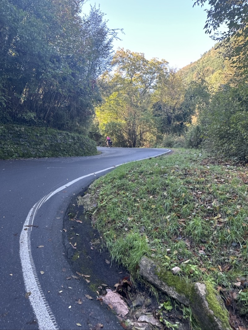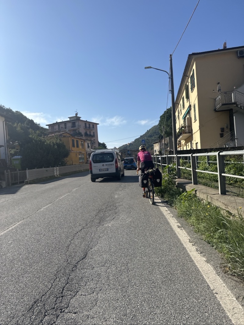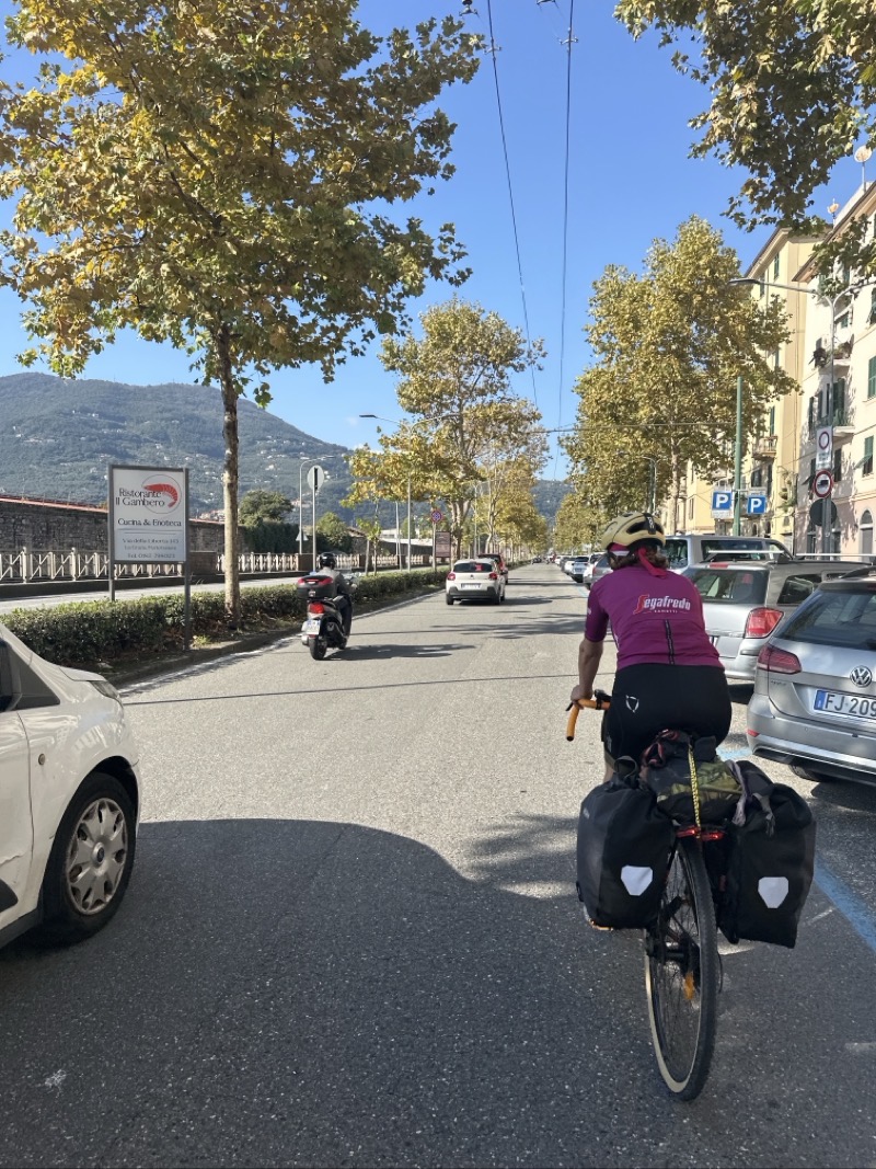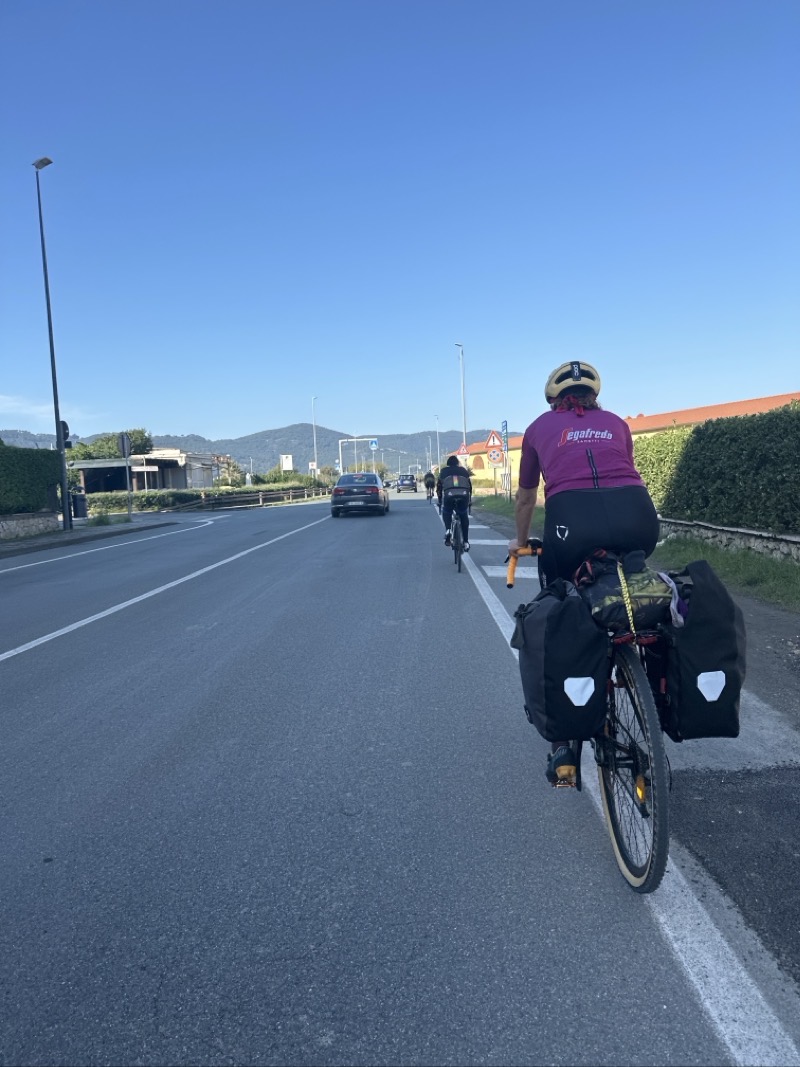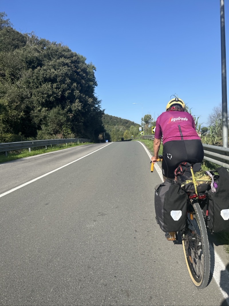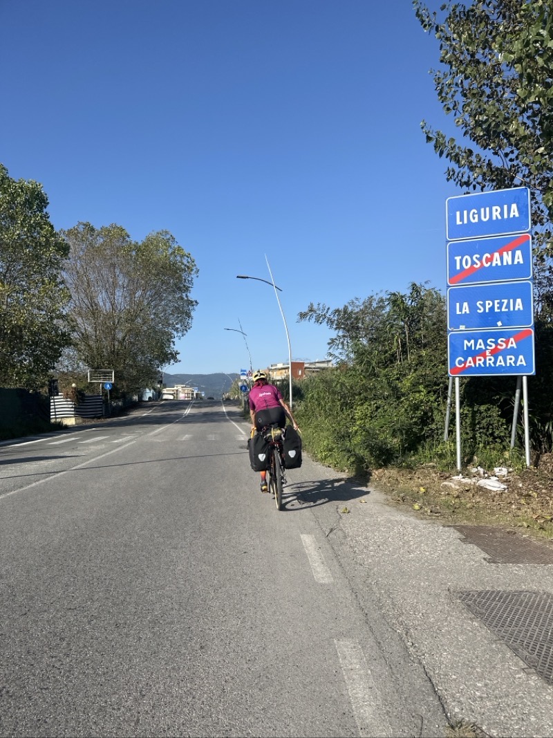 Auf der SS432 südlich von La Spezia begegnenen wir zahlreichen Radlern und ein, zwei kurze Tunnels sind auch dabei, die wir unerschrocken meistern! Bei Cafaggio entscheiden wir uns für eine Abkürzung durch das Montemarcello Magra Gebirge auf der Via Provinciale und verzichten so auf viele Höhenmeter, aber leider auch auf das bestimmt sehenswerte Fischerdorf Lerici!