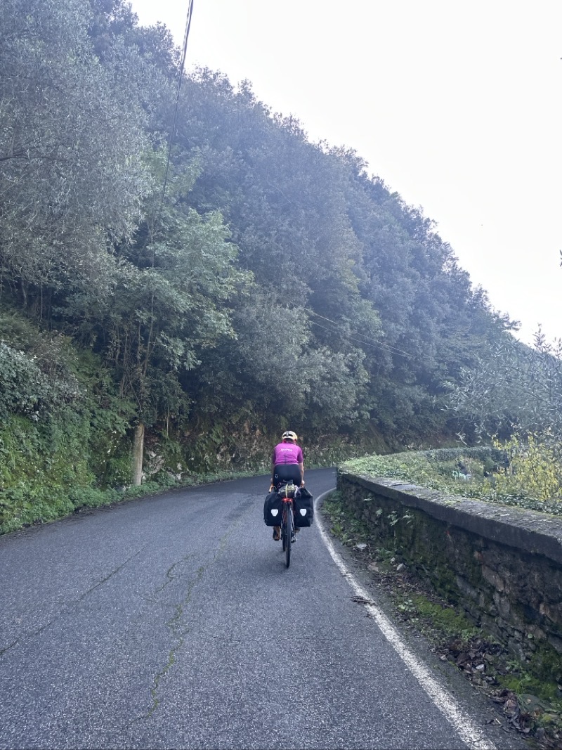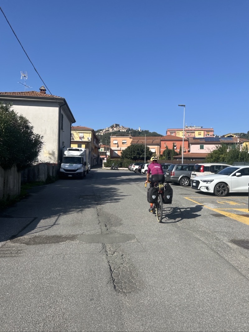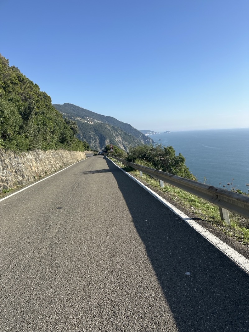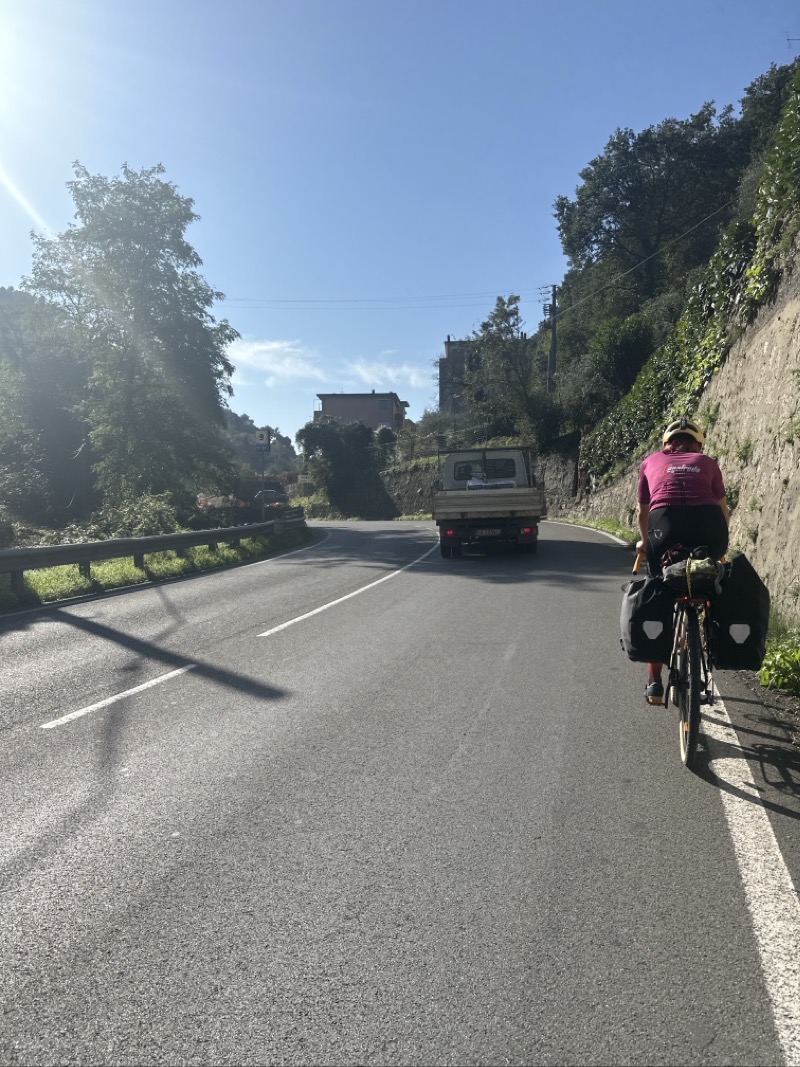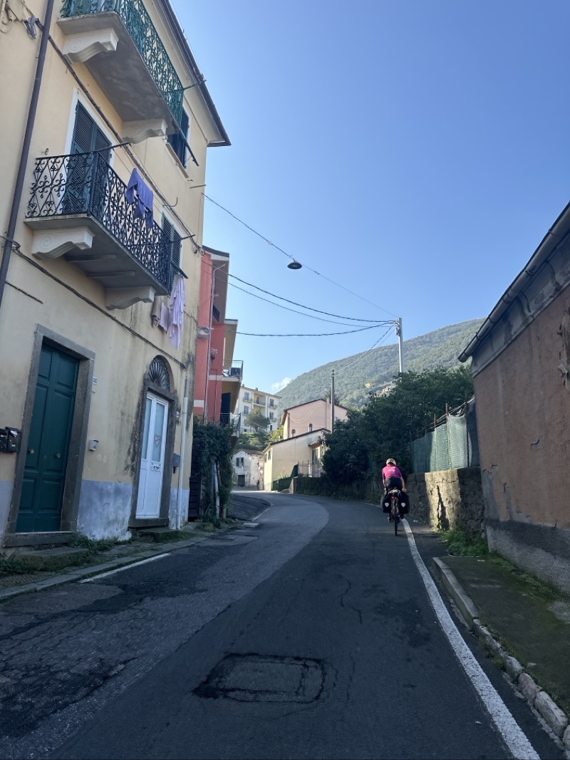 Über die teils sehr steile Via Fabio Filzi und zahlreiche Serpentinen strampeln wir bis zum Bergdörfchen Biassa, das man über hunderte Stufen vom Meer aus gut zu Fuß erreichen kann. Wir könnten über die Via delle Cinque Terre abkürzen, entscheiden uns aber für die anstrengendere, dafür aber verkehrsarme Variante.