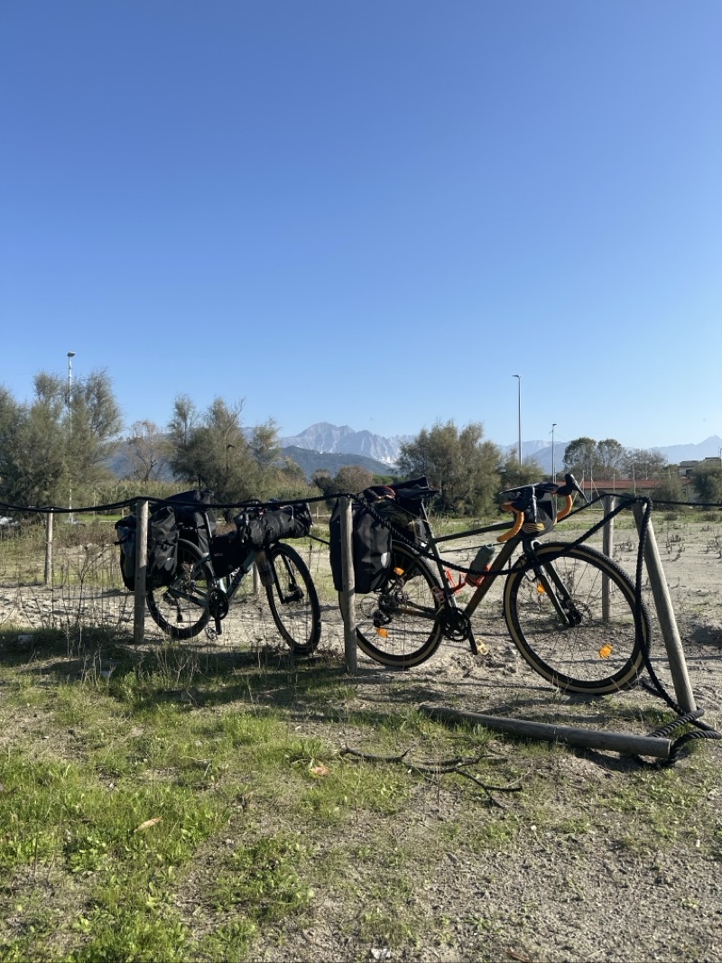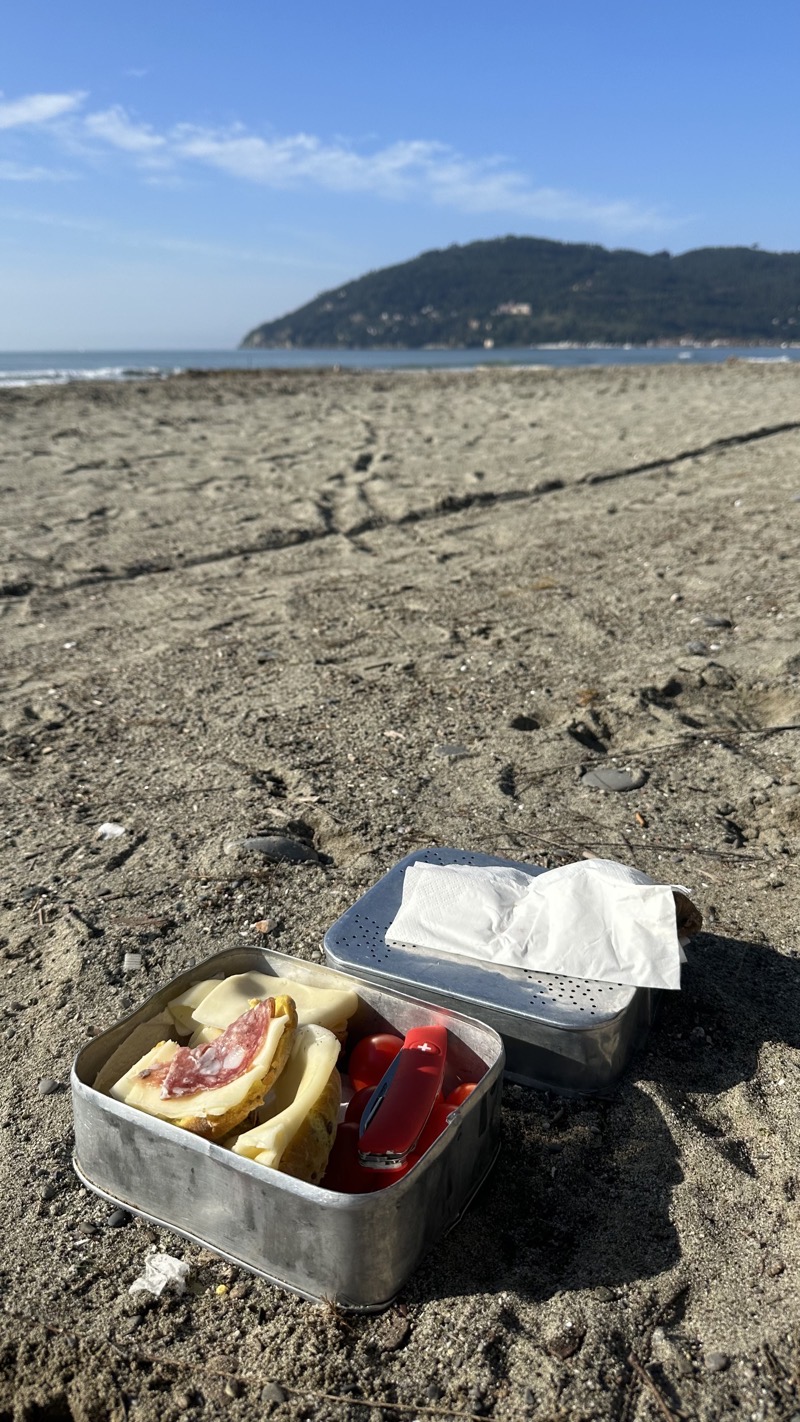 An einem menschenleeren, ligurischen Strand in der Nähe von Marinella di Sarzana legen wir eine Jausenpause ein! Es schmeckt alles soooooo köstlich nach körperlicher Anstrengung und einem Ausblick wie diesem!!!!