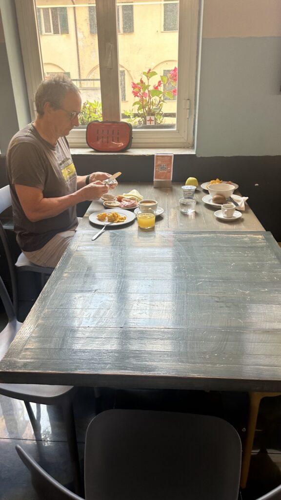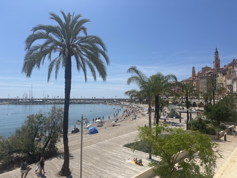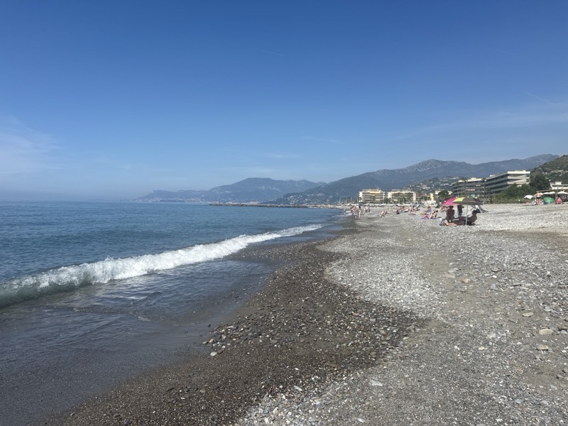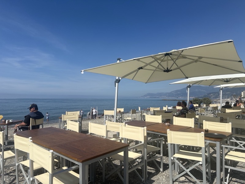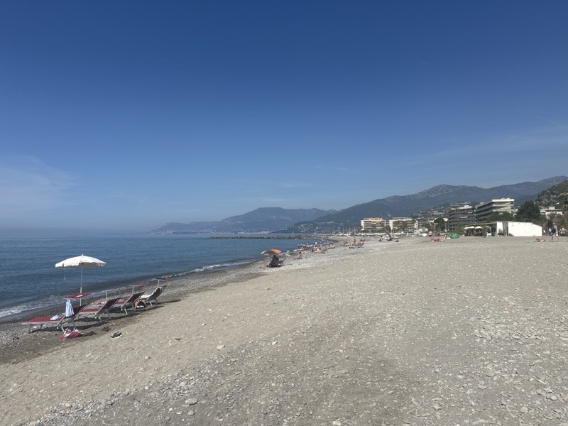 Am Promenadenradweg von Bordighera und Vallecrosia halten wir Ausschau nach einem lauschigen Lokal und einem geeigneten Badestrand. Wir waren bis jetzt noch kein einziges Mal im Meer!!!