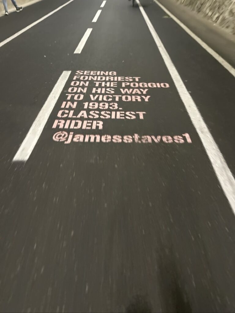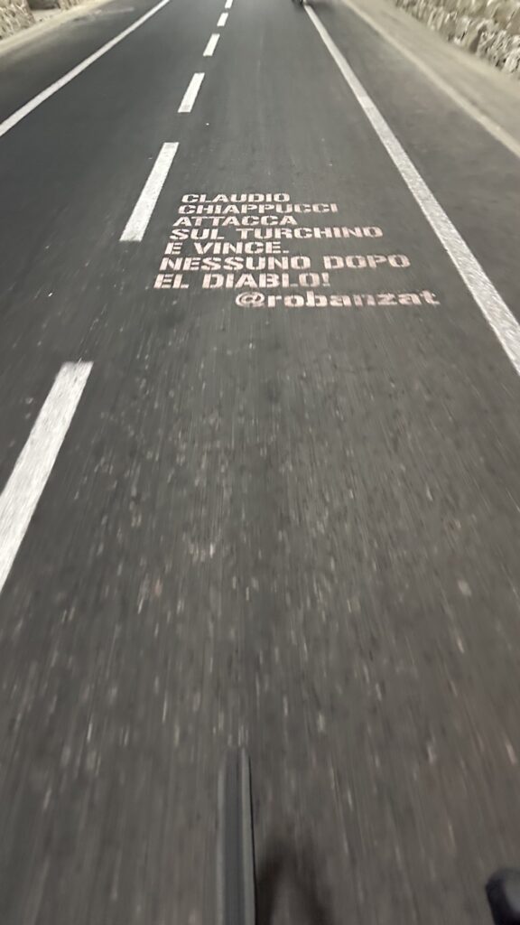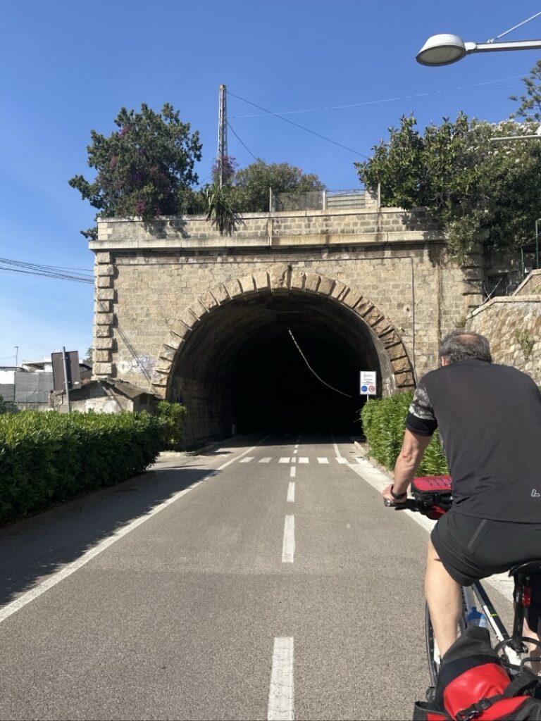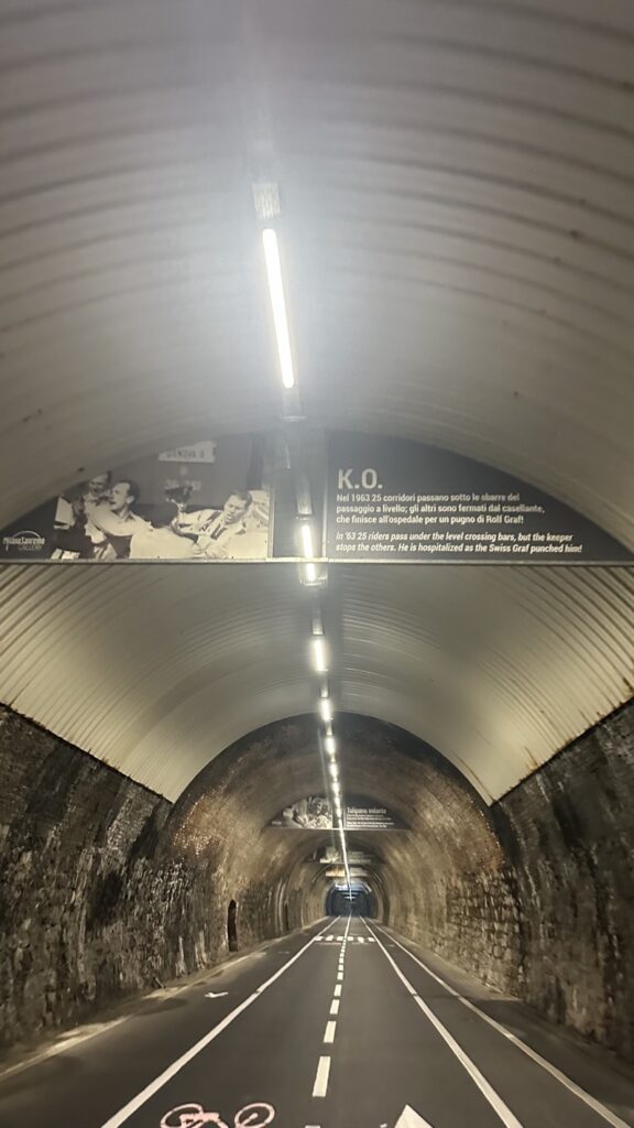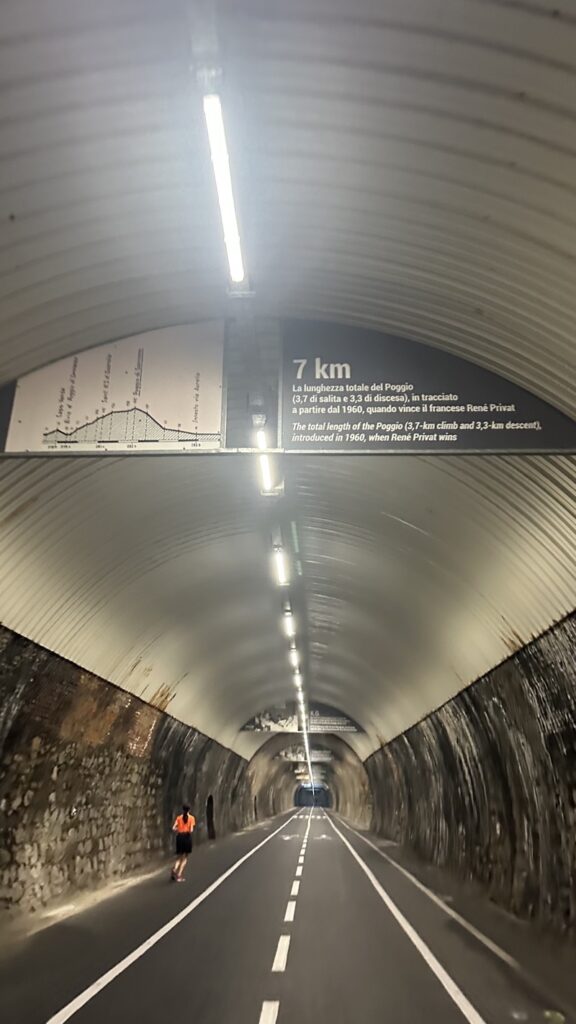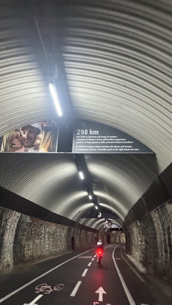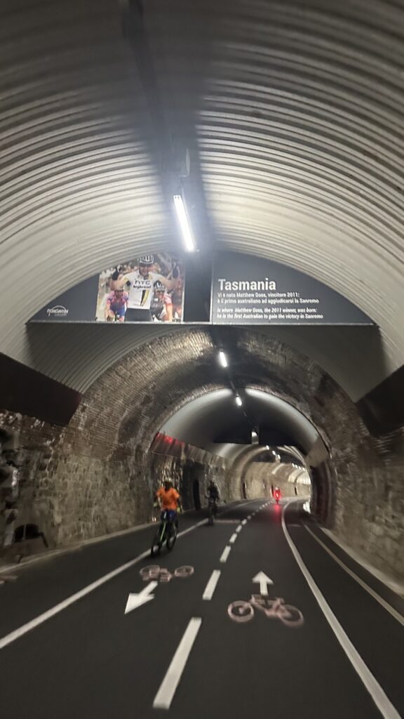 Die Galleria Capo Nero auf der Höhe des gleichnamigen Kaps ist etwas Besonderes! Hier muss man entweder schnell im Lesen sein oder so langsam fahren, damit sich die Texte im Vorbeifahren überhaupt überfliegen lassen. Eigentlich unmöglich! Also macht man es so wie ich und fotografiert die alle 100 Meter angebrachten Tafeln und aufgesprühten Schriftzüge am Boden einfach ab. Das mache ich mittlerweile geschickt während ich radle… Der Tunnel ist sehr lang und dementsprechend viele Informationen über die italienische Radfahrgeschichte sind hier, wie in einem Museum, untergebracht.