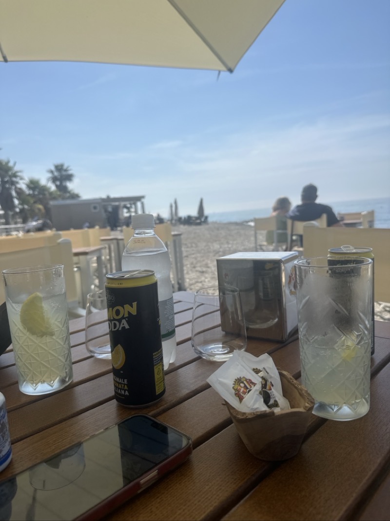 Kurze Verschnauf- und Badepause bei unserem Lieblingsgetränk Lemon Soda mit Eiswürfel!