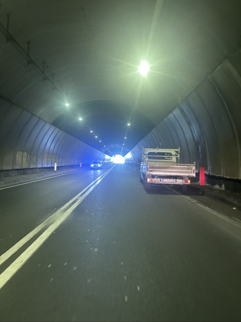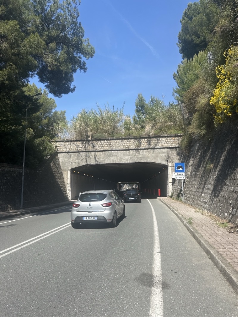 Am Hügel angekommen, erscheint vor unseren Augen ein schreckliches Ungetüm! Eine dunkle, schmale Röhre mit sehr viel Verkehr, der nicht gerade langsam in Richtung Frankreich rollt! Sollen wir so kurz vor unserem Ziel aufgeben? Nein, das kommt nicht in Frage, für Harald sowieso nicht und für mich auch nicht. Lichter an und durch, lautet die Devise. In diesem Tunnel habe ich zum ersten Mal in einem Tunnel in Italien richtig Angst!