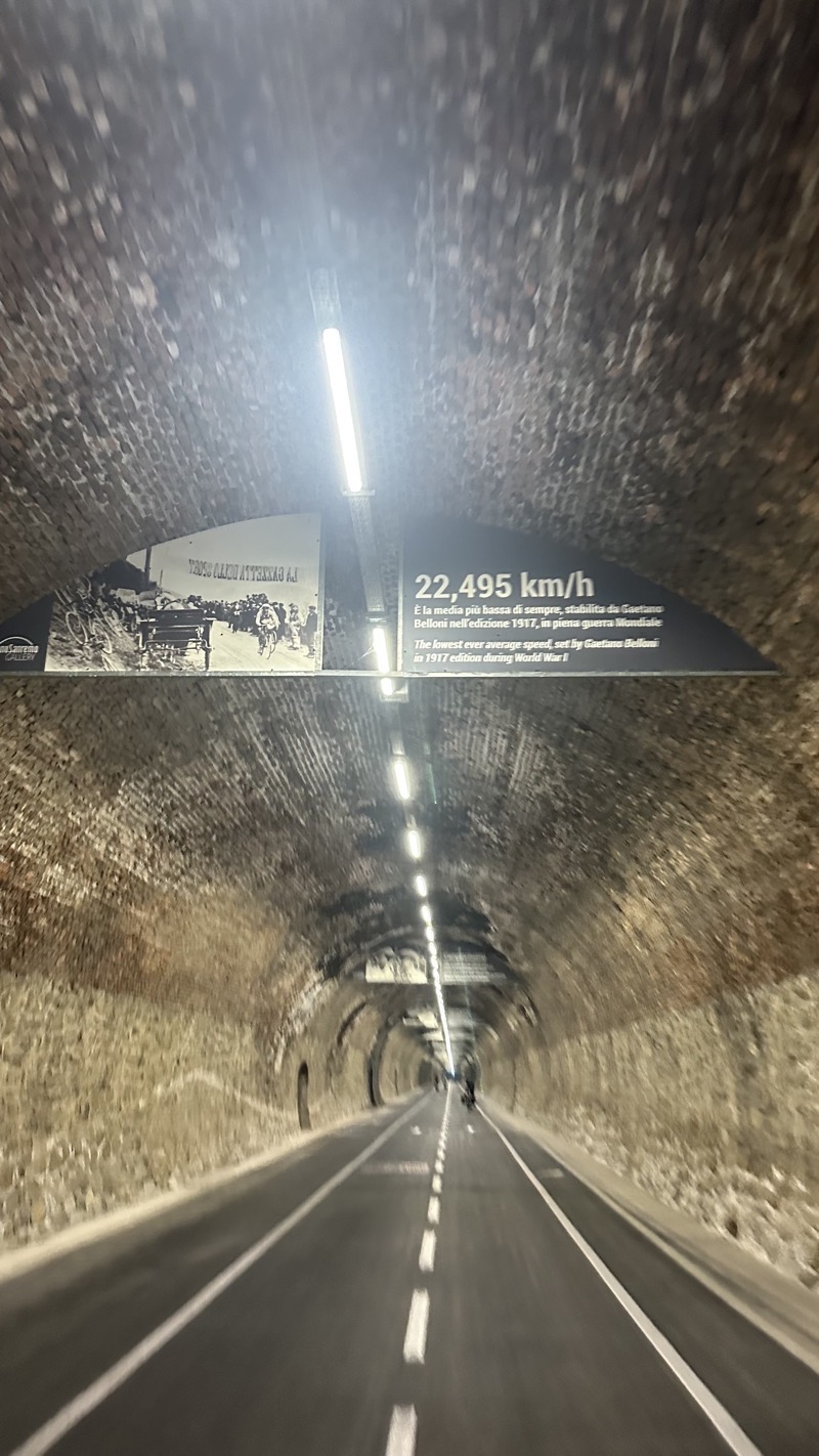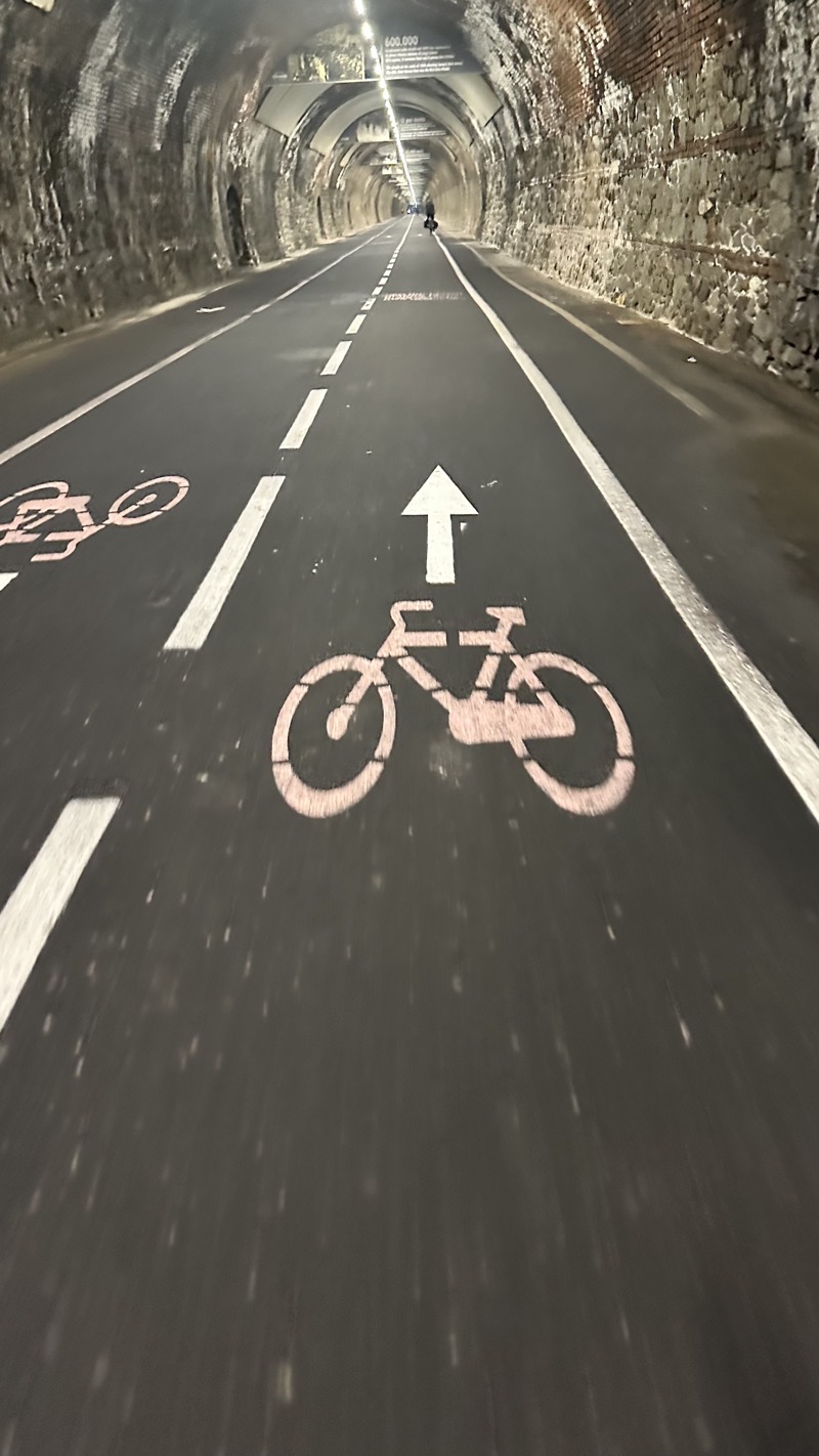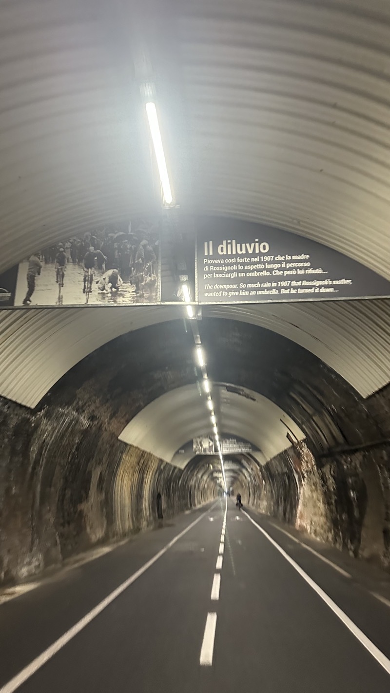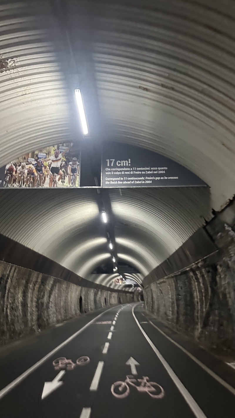 Die Galleria Capo Nero auf der Höhe des gleichnamigen Kaps ist etwas Besonderes! Hier muss man entweder schnell im Lesen sein oder so langsam fahren, damit sich die Texte im Vorbeifahren überhaupt überfliegen lassen. Eigentlich unmöglich! Also macht man es so wie ich und fotografiert die alle 100 Meter angebrachten Tafeln und aufgesprühten Schriftzüge am Boden einfach ab. Das mache ich mittlerweile geschickt während ich radle… Der Tunnel ist sehr lang und dementsprechend viele Informationen über die italienische Radfahrgeschichte sind hier, wie in einem Museum, untergebracht.