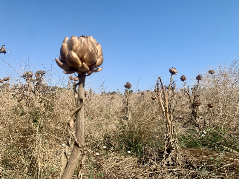 Zwischen Squinzano und Trepuzzi bleiben wir bei einem verdorrten Artischockenfeld stehen. Es ist uns nicht sofort klar, dass es sich um Artischocken handelt.