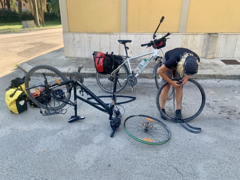 …wechseln einen Schlauch. Besser gesagt: ICH wechsle einen Schlauch und bin schon ganz schön schnell darin!! Harald steht mir mit kleinen Tipps zur Seite und ich bin wieder mal unendlich froh, dass er mit dabei ist, denn ohne ihn würde ich mich in dieser Siedlung nicht gerade wohl fühlen.