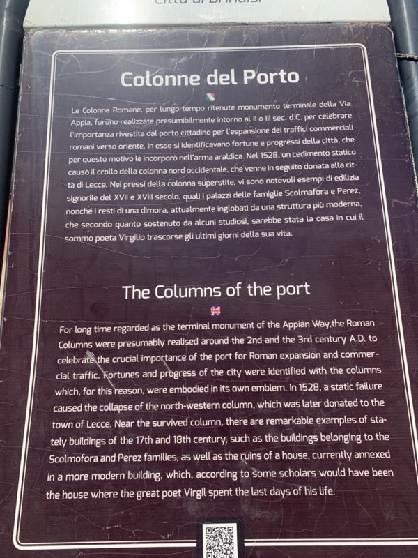 Brindisi ist eine äußerst sehenswerte Stadt mit einer jahrtausendelangen Geschichte. Hier im Überblick aus: https://de.wikipedia.org/wiki/Brindisi