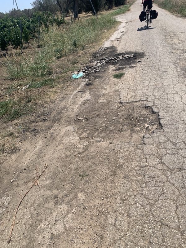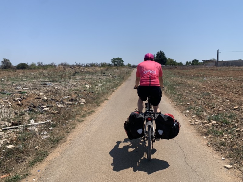 In Tuturano verirren wir uns zum zweiten Mal an diesem Tag, bemerken es aber Gott sei Dank schnell. Wir haben noch 30 Kilometer vor uns, die geprägt sind von karger, verdursteter Landschaft, kaputtem Asphalt und viel Müll am Straßenrand.