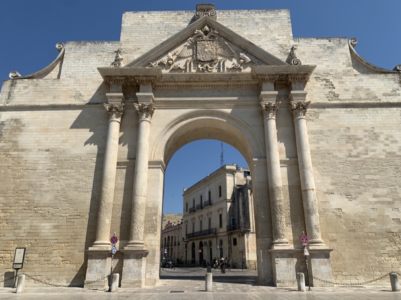 Das Stadttor wurde Mitte des 16. Jahrhunderts zu Ehren von Kaiser Karl V. Habsburg errichtet. Es ähnelt einem alten Triumphbogen und beschreibt die großen Siege der kaiserlichen Armee. Auf der Außenseite befindet sich ein Tympanon mit dem Wappen Karls V. und ritterlichen Symbolen über zwei Säulenpaaren (https://tropter.com/de/italien/lecce/porta-napoli).