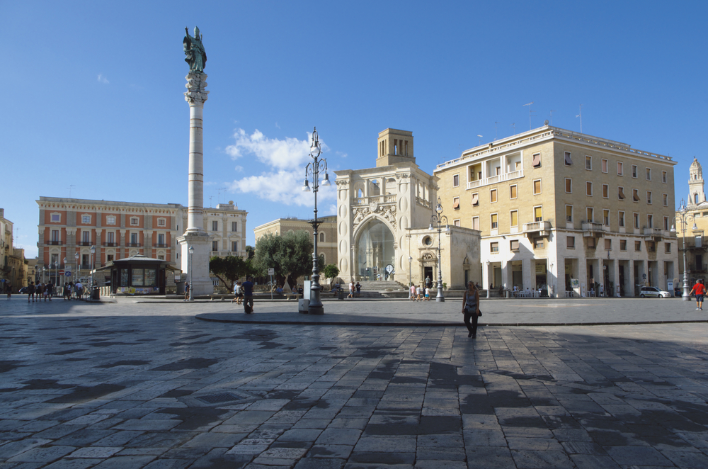 Der Platz liegt mitten im Zentrum und weist die typische gemischte Architektur zwischen dem Mittelalter und dem 19. Jhdt. auf. Er ist dem Schutzpatron von Lecce gewidmet. Seit 1656 gab es eine Pestepidemie, die das gesamte Königreich Neapel heimsuchte, nur Lecce blieb verschont. Das musste der Hl. Oronzo bewirkt haben, davon waren Volk, Klerus und der Bischof Luigi Pappacoda überzeugt. Daher wurde ihm zu Ehren eine Säule aufgestellt. 29 m hoch trägt sie die Kupferstatue des Heiligen, der die Stadt segnet. Sie wurde in Venedig gegossen.
