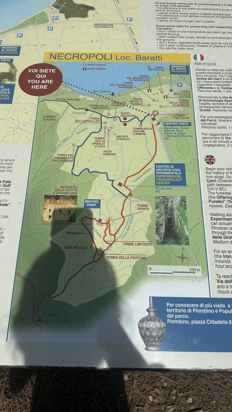 Der archäologische Park fasst die Akropolis auf der Anhöhe und die Hochöfen und Werkstätten zur Eisenerzverhüttung sowie die Nekropolen in der Ebene zusammen, deren Standorte einige Kilometer voneinander entfernt liegen. Auf gut beschilderten Rundwegen kann man die Überreste der Erzverarbeitung und verschiedene Nekropolen besichtigen, wobei dem unteren Gelände ein Besucherzentrum mit Buchladen und Selbstbedienungsrestaurant und ein Experimentiergelände für Schüler angegliedert ist. Die Necropoli delle Grotte liegt an den Abhängen des Hügels, auf dem sich die Akropolis befindet. Sie datiert aus der hellenistischen Epoche vom 4. bis zum 2. Jahrhundert vor Christus. Hier wurde eine mächtige Anlage in Gestalt einer Felswand mit aus dem Kalkstein geschlagenen Höhlengräbern freigelegt. Daneben finden sich dort etliche Grüfte, die in Form schmaler, ebenfalls aus dem Fels herausgearbeiteter Gänge mit steil aufragenden Seitenwänden in die Tiefe zu kleinen Grabkammern führen, in denen die Leichname bestattet waren. In der Totenstadt San Cerbone in der Ebene nahe der Küste finden sich drei Formen von Grabstätten aus dem 7. bis 6. Jahrhundert vor Christus. Es handelt sich um Tumuli verschiedener Größen, Sarkophage und Totenhäuser, in denen zahlreiche kleinere Gegenstände aus Silber und Bronze gefunden wurden. Der Tumulus Tomba dei Carri misst 28 Meter im Durchmesser. Er birgt in seinem Zentrum eine kuppelförmige Grabkammer und daneben zwei kleinere Kammern, in denen die Überreste zweier hölzerner, bronzeverkleideter Streitwagen gefunden wurde. Mehrere andere, kleinere Tumuli sind in verschiedenen Erhaltungszuständen in der Nähe verstreut, und am Rande des Gräberfeldes steht, umgeben von Sarkophagen, ein Totenhaus in der Bauweise eines Tempelchens. Auf einem speziellen Pfad, der Via del Ferro, der Eisenstraße, wird der Besucher mit den Resten der Werkstätten bekannt gemacht, in denen die Erzverarbeitung stattfand. Es finden sich auch Reste von Hochöfen und Schmelzrückstände aus der damaligen Produktion. Die Akropolis stellt die Oberstadt der römischen Siedlung dar. Auf dem Hügel gegenüber dem bestehenden Ort finden sich die frühesten Spuren der etruskischen Besiedlung. Darunter gruppieren sich um einen zentralen Platz die Reste römischer Tempel. Eine breite gepflasterte Straße führt gesäumt von Gebäuden hangaufwärts. Bei einem Rundgang tritt an einigen Stellen die Ringmauer zutage, die die Stadt umgab. In etruskischer Zeit erstreckte sich die Ansiedlung von der Oberstadt über bebaute Terrassen hügelabwärts bis zum Hafen und den Industriegebieten und Nekropolen in der Ebene nahe der Küste (https://de.wikipedia.org/wiki/Populonia).