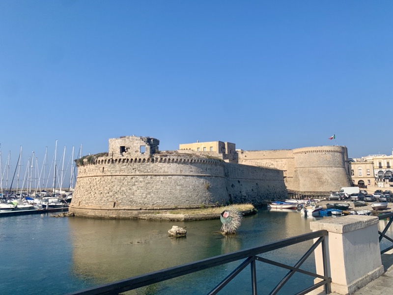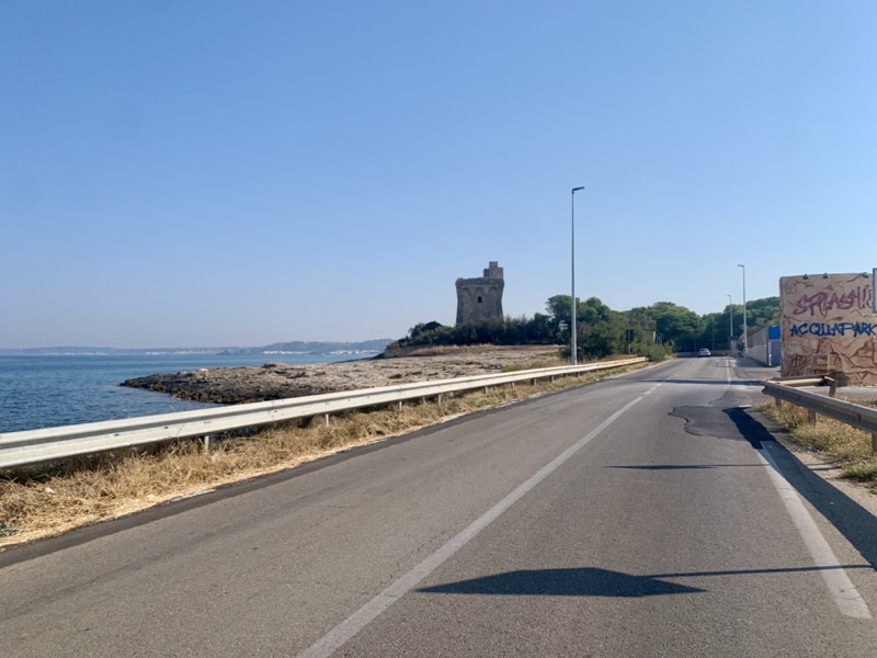 Bei der Ausfahrt aus Gallipoli fotografiere ich noch einmal die imposante Festung „Castello Aragonese“, die im 11. Jahrhundert auf den Fundamenten einer alten, römischen Festung erbaut und dann, in byzantinischer Zeit, im 13. Jahrhundert umgebaut wurde. Um auf die andere Seite der Straße und der Bahnlinie zu gelangen, müssen wir mit geduckten Köpfen durch eine Fußgänger-Unterführung…
