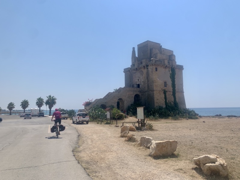 Wir verbringen unsere Mittagspause in Torre Colimena, wo es allerdings kein einzig annehmbares Lokal gibt. Wir begnügen uns mit jeweils zwei Bieren und ein paar Chips in einer Bar und freuen uns über den wunderschönen Wehrturm…