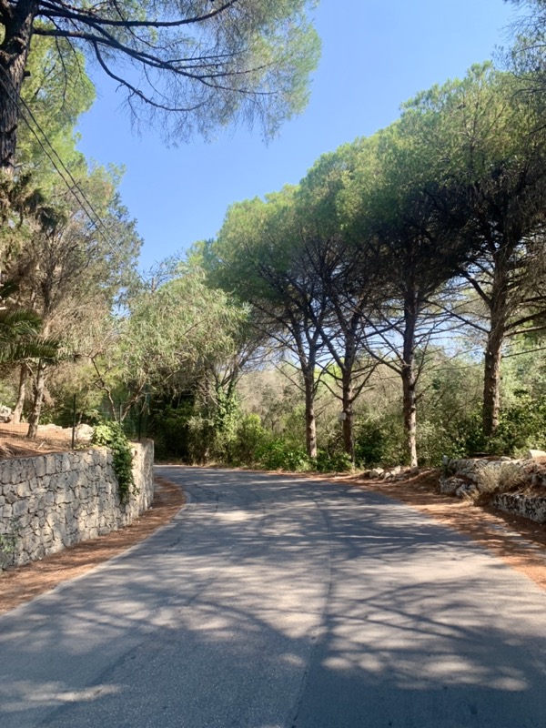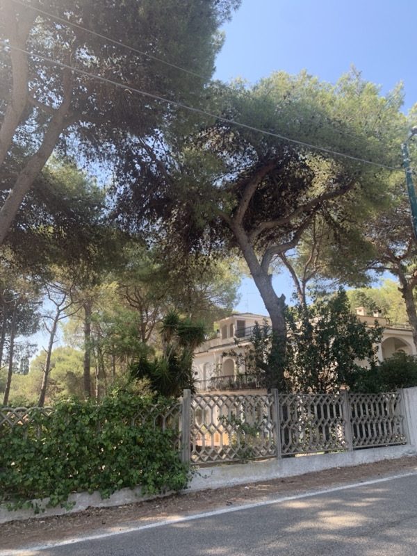 Nördlich von Santa Caterina liegen auf einer Anhöhe luxuriöse Villen. Die Straße, sowie die Olivenhaine machen einen sehr gepflegten Eindruck. Linker Hand, auf der Meerseite, befindet sich ein üppiger Pinienwald, den wir im Landesinneren umfahren müssen.