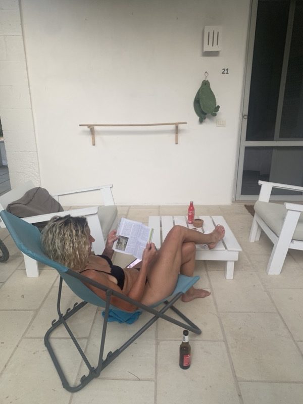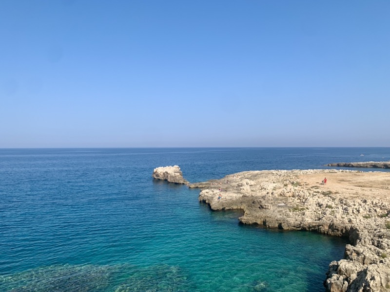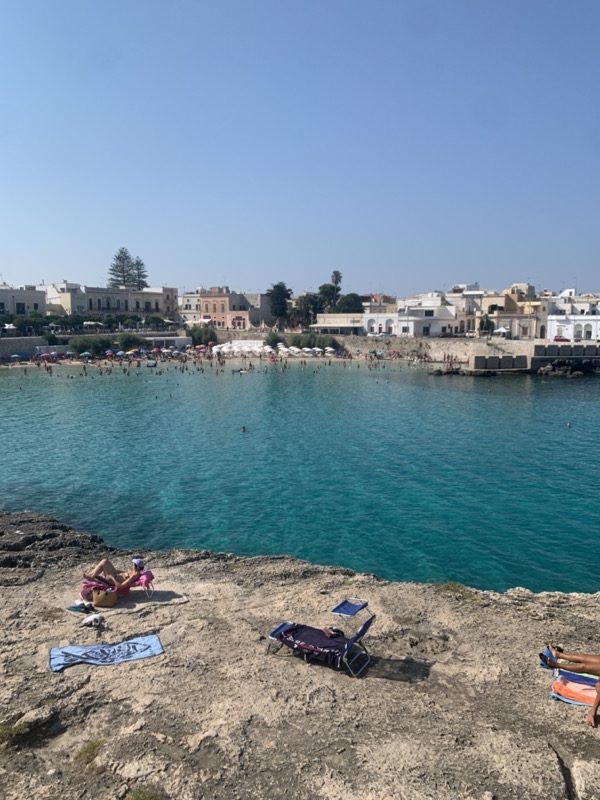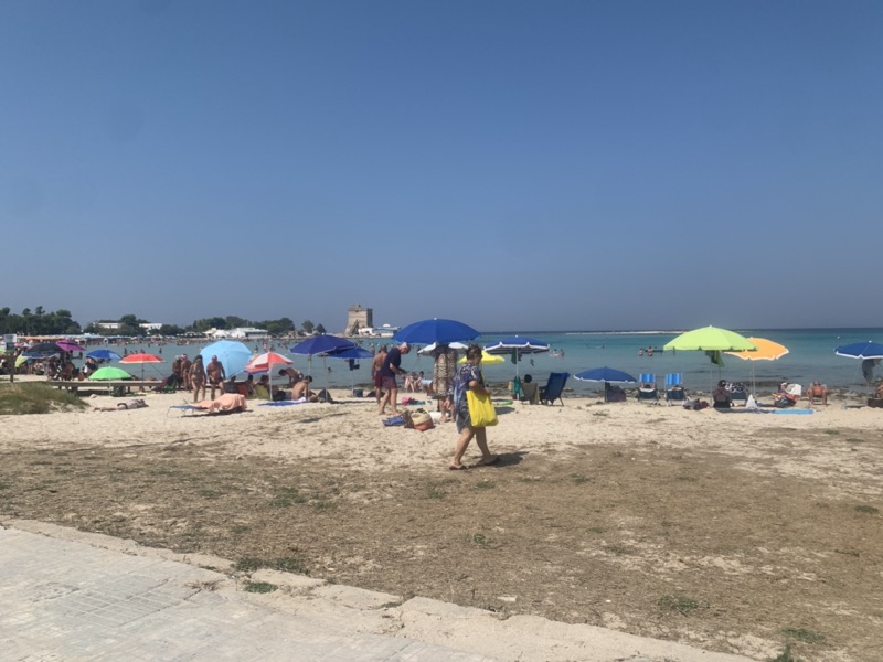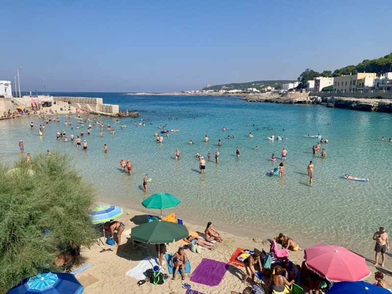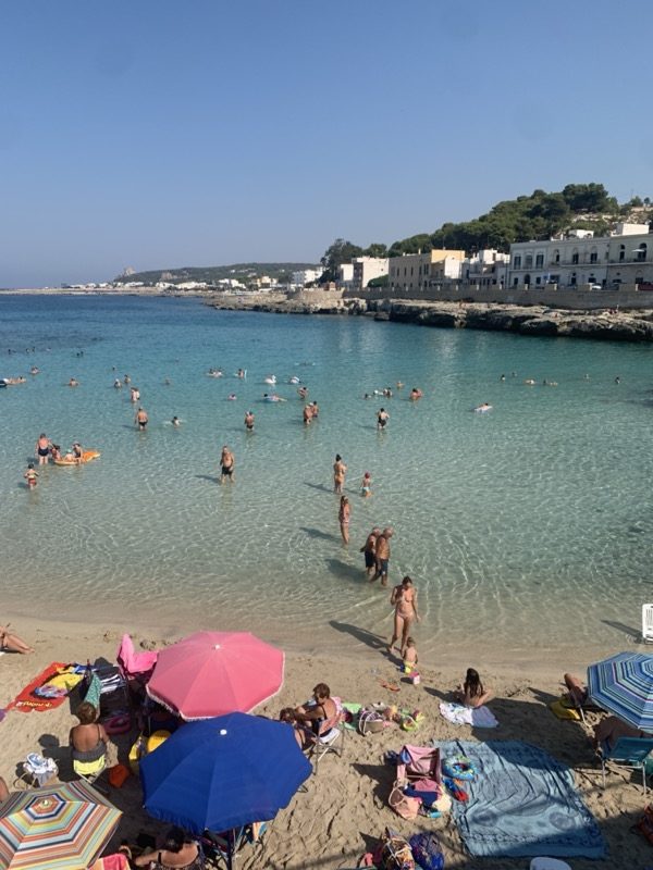 Der kleine Badeort Santa Maria al Bagno ist ein kleines Juwel am Ionischen Meer. Die Badebucht mit glasklarem Wasser lädt die Besucher zum Baden ein. Wir beobachten die italienischen Badegäste, wie sie teils nur bis zu den Knien im Wasser stehen, sich angeregt unterhalten und ihre Beine vom Wasser umschmeicheln lassen… Mehrere Mamas, aber auch Omas sitzen mit großen Kühlboxen unter den Schirmen.