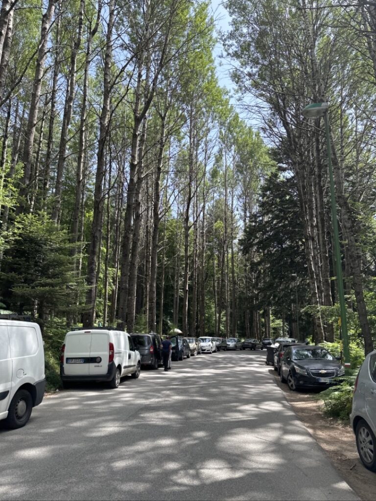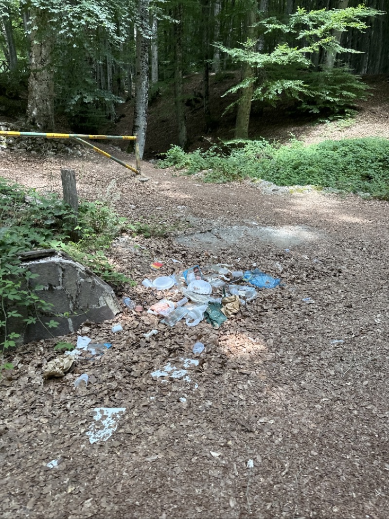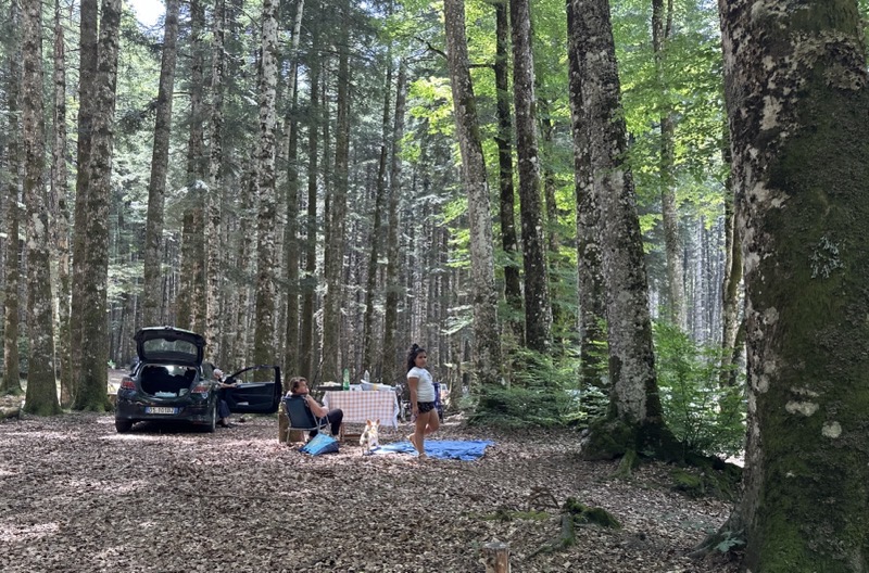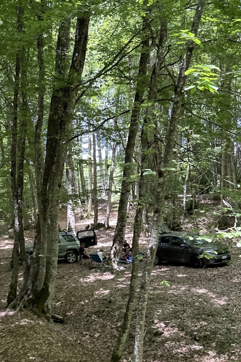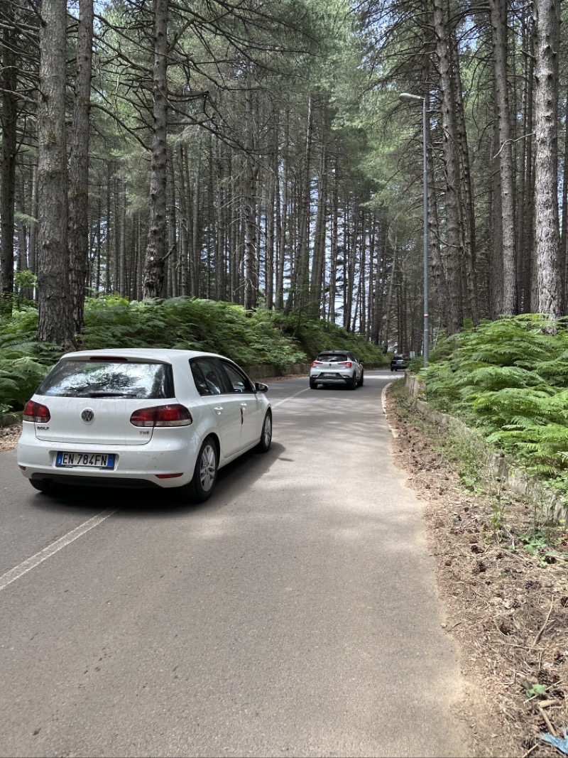 Wo Italiener (zumindest jene im Raum Reggio di Calabria) mit dem Auto hinkommen, da fahren sie auch hin. Kein Schritt wird unnötig zu Fuß gegangen, so unser Eindruck. Aus dem Auto werden Klappstühle und -tische, Decken und viel Jause ausgepackt und im Kreis der großen „famiglia“ verzehrt. Dabei legen anscheinend nicht alle viel wert auf sauberes Verlassen der Erholungsstätte, was der herumliegende Müll im Wald verrät.