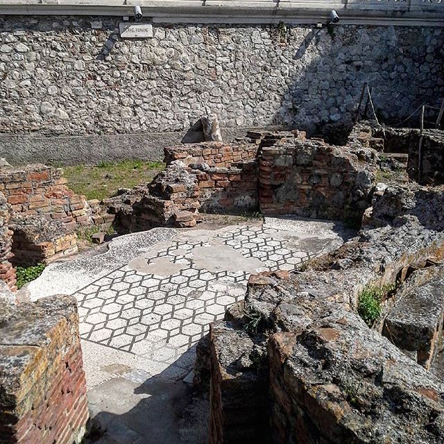 Die römischen Thermen befinden sich im letzten Teil der Uferpromenade Falcomatà, wurden während der Wiederaufbauarbeiten nach dem Erdbeben von 1908 gefunden und sind eine der berühmtesten Sehenswürdigkeiten der Stadt Reggio Calabria. Aufgrund ihrer Größe waren die Thermen wahrscheinlich Teil eines privaten Hauses. Diese Reste zeigen mehrere Bauphasen; sie waren für lange Zeit von einem Wachtturm der spanischen Stadtmauer bedeckt (Bastion von San Matteo), der mit dafür gesorgt hat, dass sie erhalten blieben. Vom ursprünglichen Grundriss ist heute zu sehen: ein elliptisches Becken für die Warmbäder, dem einige geheizte Räume vorgeschaltet waren (tepidarium und calidarium), ein quadratisches Becken für Kaltbäder und einen kleinen halbkreisförmigen Umkleideraum mit schwarz-weißem Mosaikfußboden. Während der Ausgrabungen dieser Thermen wurden auch Teile des Mauerputzes mit maritimen Motiven gefunden. Das Mosaik aus dem 2./3.Jh. vor Chr. ist geometrisch, mit weißen Kalkstein- und schwarzen Lava-Teilchen sizilianischen oder äolischen Ursprungs. Ein kleiner Teil des Rahmens zeigt auch graue Teile (aus der Restaurierung). Die eigentliche zweifarbige Gestaltung ist nur im mittleren Teil des Bodens angewandt und mit einem rechteckigen schwarzen Rahmen umfasst, der wiederum mit weißer Bordüre umgeben ist. Das Mittelmotiv besteht aus einer Reihe großer länglicher Sechsecke, deren Kombination kleine Rhomben ergibt, die am stumpfen Winkel aneinander stoßen; sie sind schwarz auf weißem Grund (https://turismo.reggiocal.it/de/kultur/archaeologie-und-geschichte/roemische-thermen).