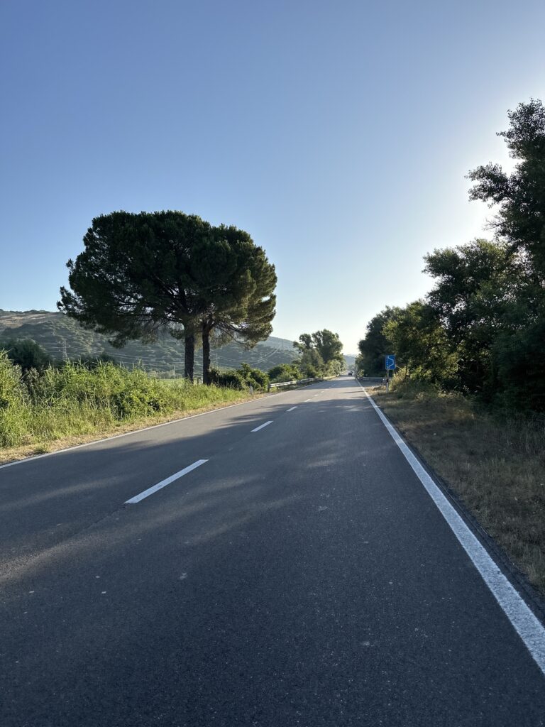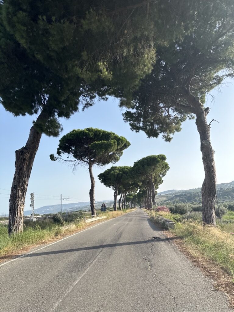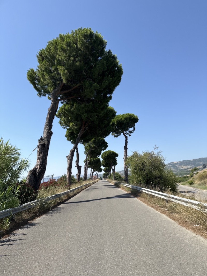 Nach der ausgedehnten Mittagspause führt uns wieder eine schöne Pinienallee aus Rocca Imperiale hinaus.