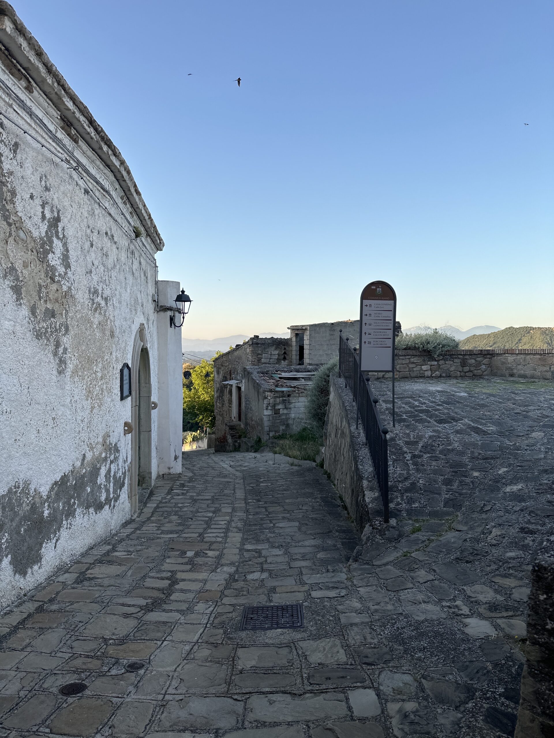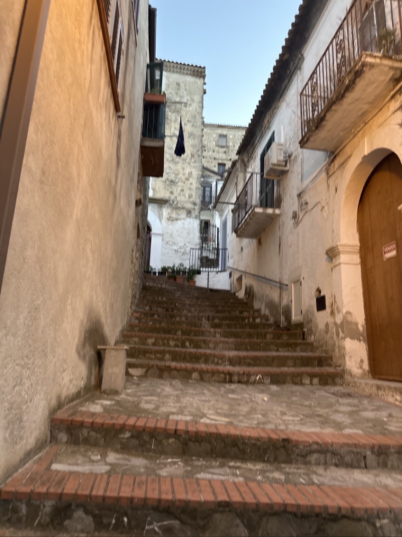 Rocca Imperiale liegt erhöht und terrassenförmig an einen Hügel geschmiegt. Es gibt viele Stufen und wieder einmal EXTREM steile Straßen, wie anscheinend in Kalabrien üblich… Dennoch verlieben wir uns sofort in dieses mittelalterliche Städtchen der Zitronen und der Poesie! Erst in der Dämmerung kümmern wir uns um eine Unterkunft und werden Gott sei Dank noch fündig… Nach längerem Suchen und zahlreichen Höhenmetern und engen Gassen finden wir schließlich unser B&B.