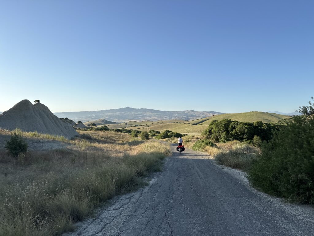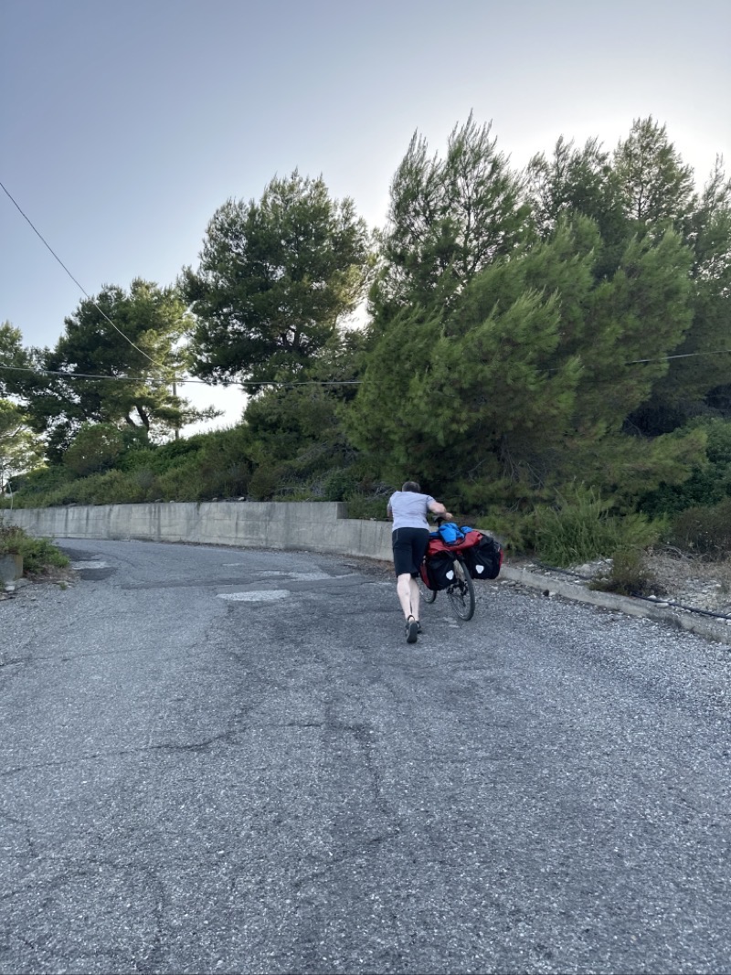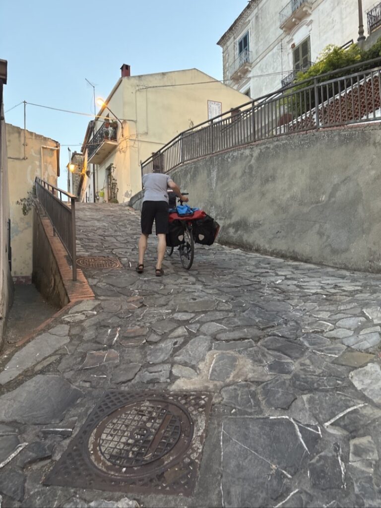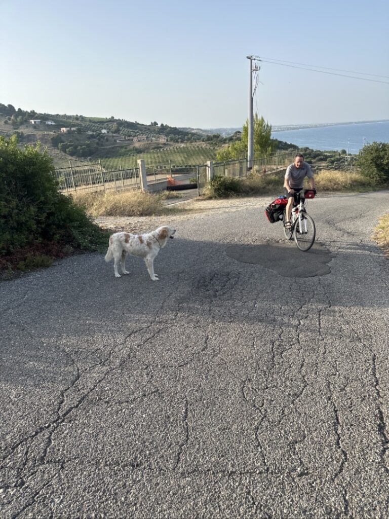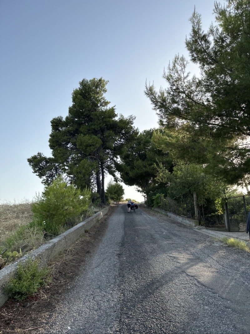 Deshalb, so der Plan, wollen wir großräumig über das Landesinnere ausweichen und biegen in Richtung Montegiordano ab. Eine EXTREM steile Nebenstraße führt uns den Berg hinauf. Zuerst kämpfen wir noch, doch schon bald müssen wir unsere Räder schieben. Ein freilaufender, aber lieber Hund begleitet uns.