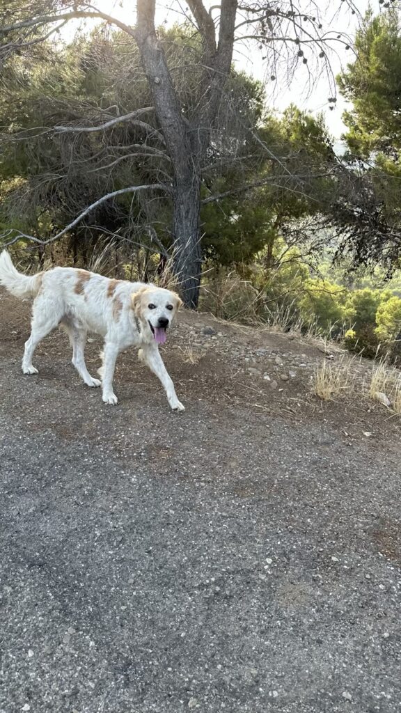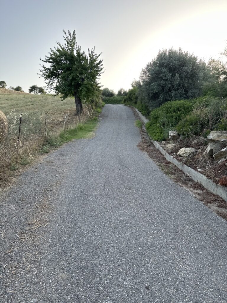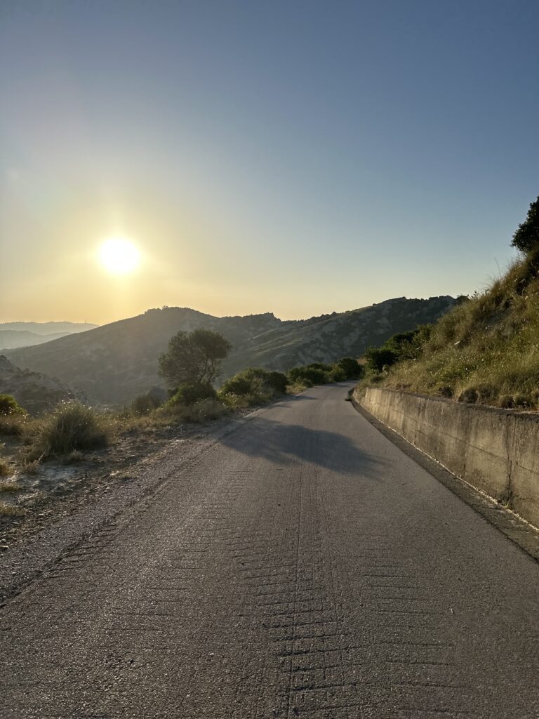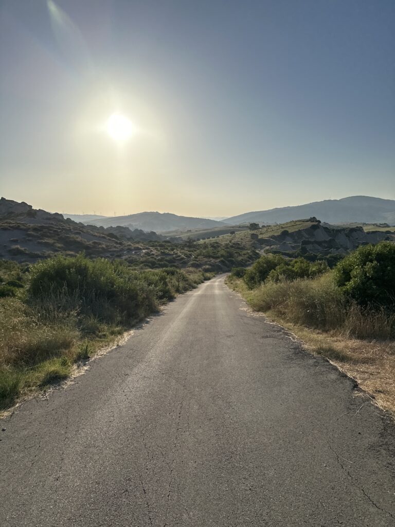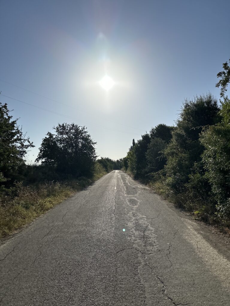 Deshalb, so der Plan, wollen wir großräumig über das Landesinnere ausweichen und biegen in Richtung Montegiordano ab. Eine EXTREM steile Nebenstraße führt uns den Berg hinauf. Zuerst kämpfen wir noch, doch schon bald müssen wir unsere Räder schieben. Ein freilaufender, aber lieber Hund begleitet uns.