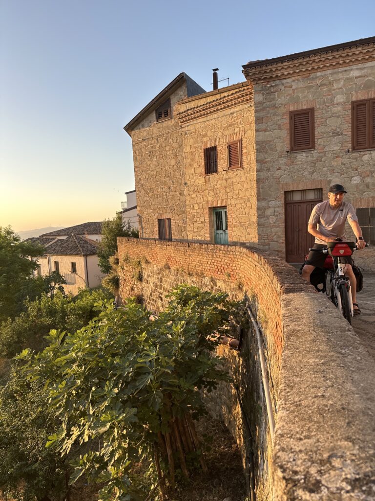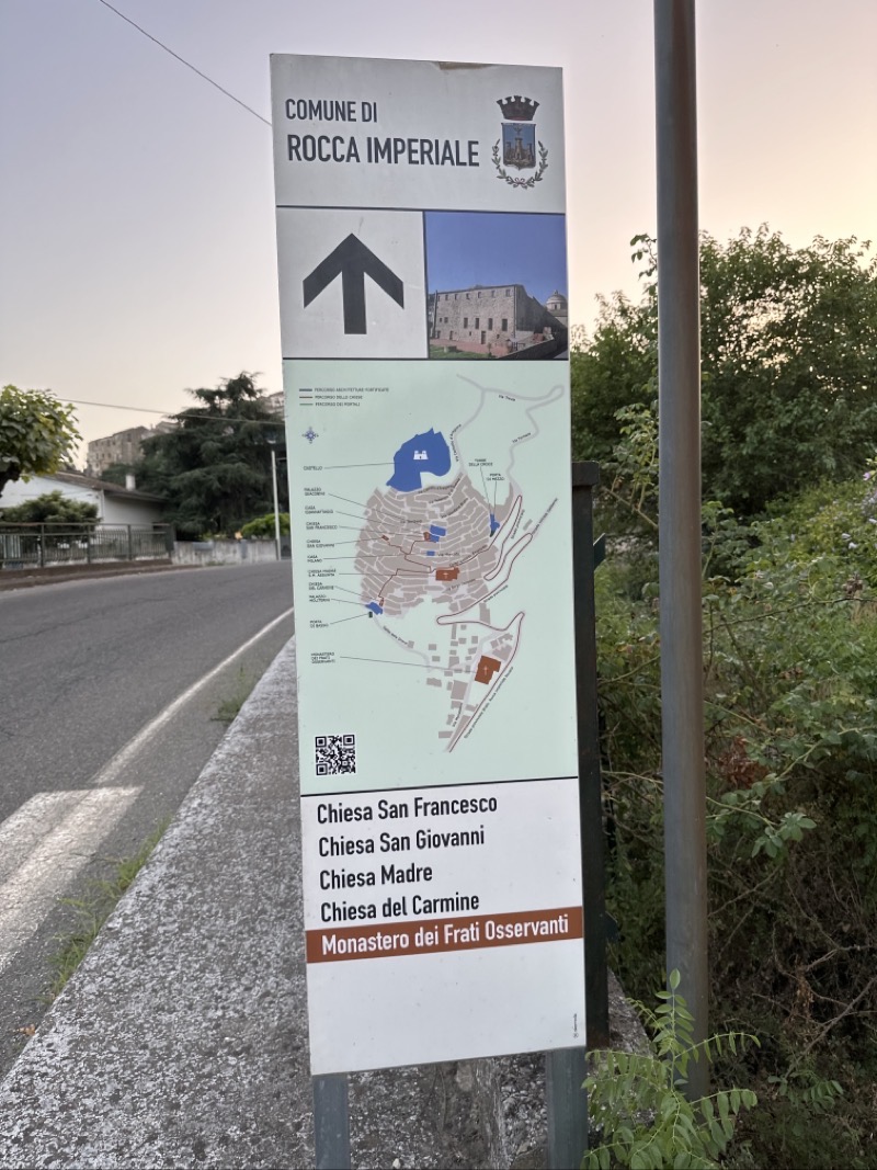 Die Steilheit nimmt kein Ende und so entscheiden wir uns zur Umkehr nach Rocca Imperiale. Dort wollen wir die Nacht verbringen. Die Stadt liegt ca. sieben Kilometer von der Küste entfernt, wie viele mittelalterliche, italienische Städte. Aus Angst vor feindlichen Angriffen vom Meer wurde früher im schützenden Landesinneren gebaut und erst später ein dazu gehöriger Lido oder eine entsprechende Marina direkt am Meer erschlossen.