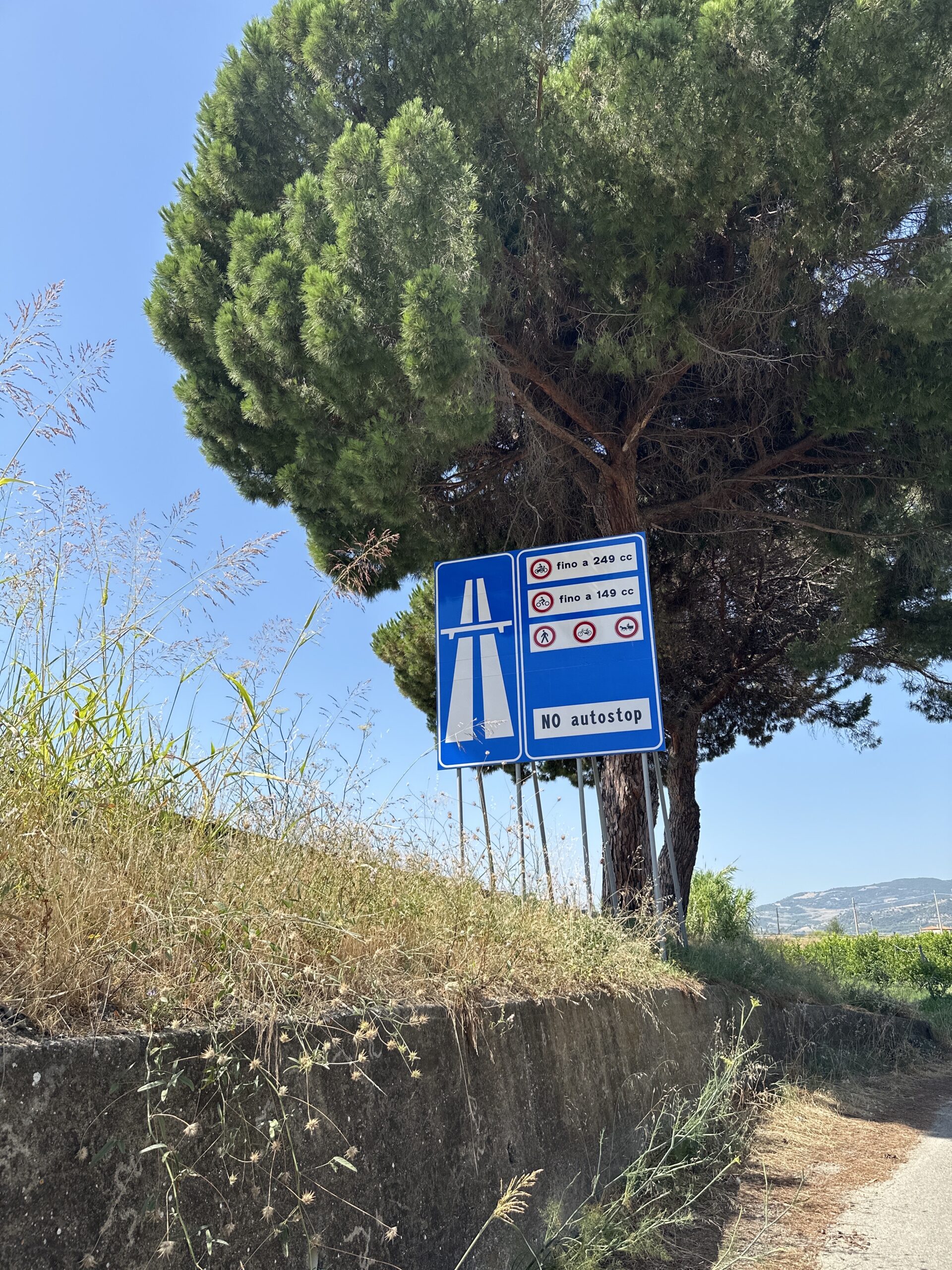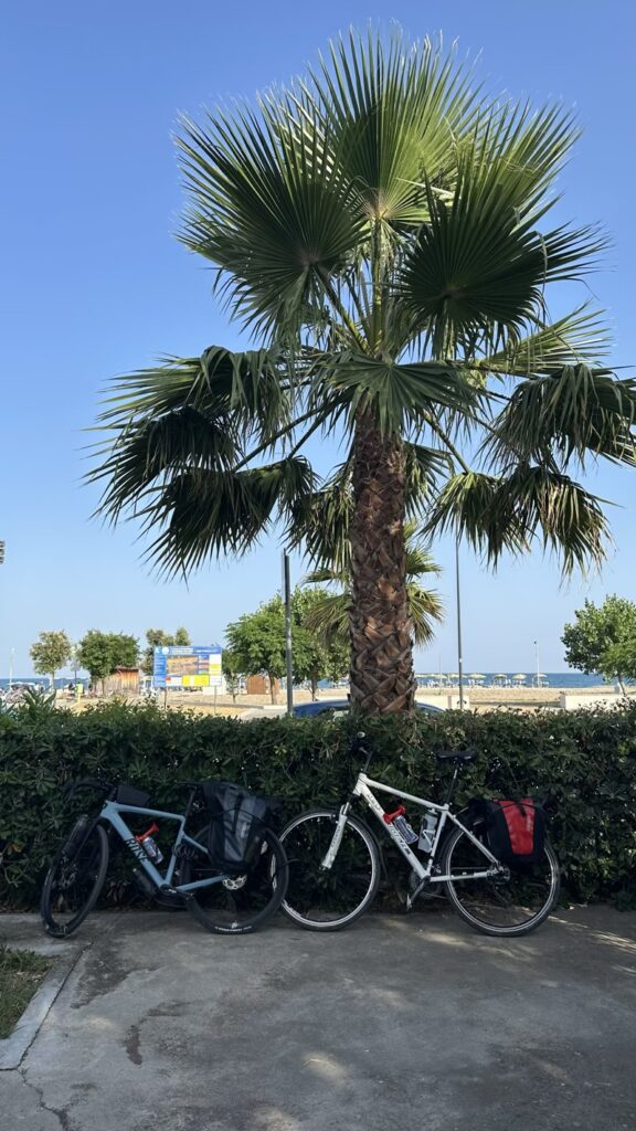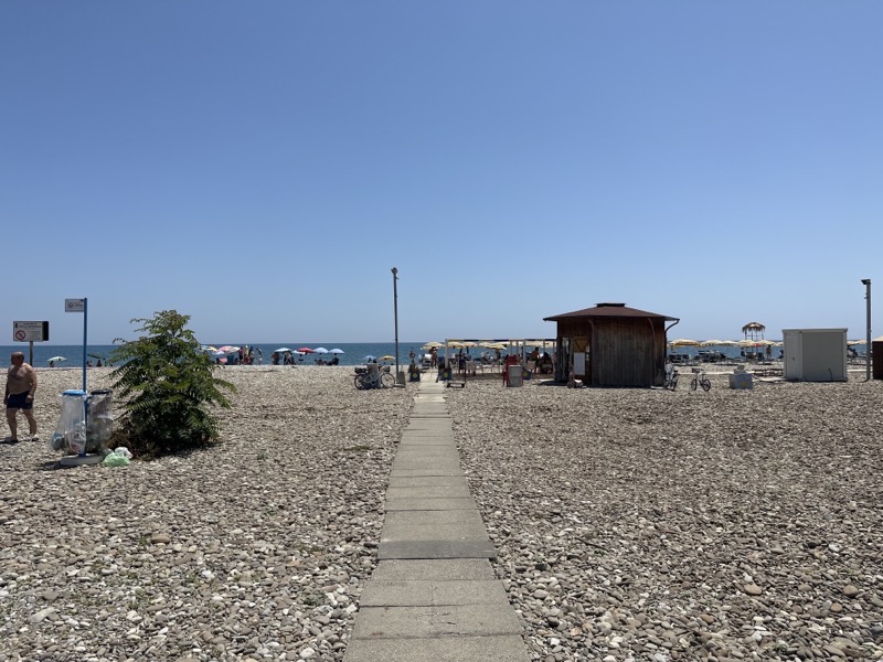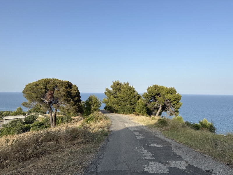 Zunächst radeln wir parallel zur Strada Statale 106 Ionica auf einer ruhigen Nebenstraße und sehen den Schwerverkehr, der sich über die Statale wälzt. Vom Kioskinhaber am Strand erfahre ich, dass es aufgrund von Bauarbeiten bei Roseto keine Alternative gäbe und wir mit allen LKWs die Ionica befahren müssten. Undenkbar für mich!!