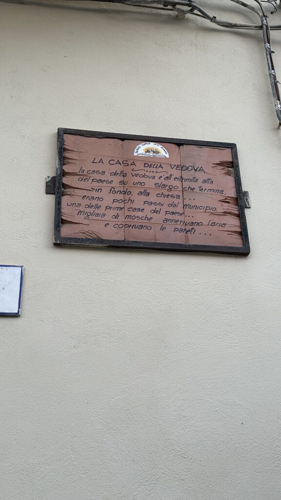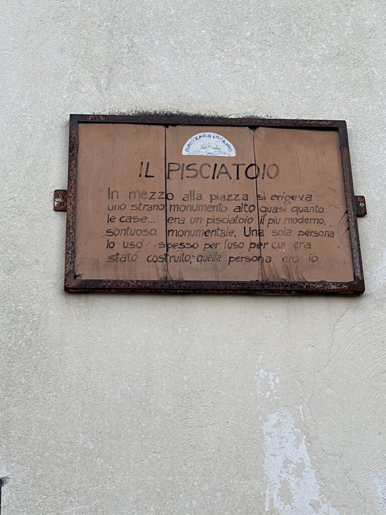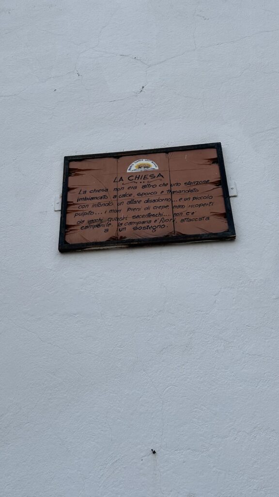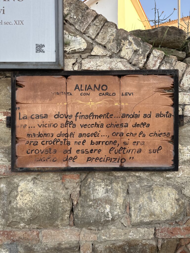 Bevor wir Aliano verlassen, sehe ich mich in der Stadt noch ein wenig um, schaue mir die Kirche „San Luigi Gonzaga“ von innen an und fotografiere Informationstafeln, die ich am Tag zuvor übersehen habe, wie z. B. das Haus der Witwe, wo Carlo Levi nach seiner Ankunft in Aliano untergebracht war, das öffentliche Pissoire und die Volksschule, auf deren Balkon der Bürgermeister in seiner Funktion als Lehrer saß, um das rege Treiben auf dem Platz zu beobachten und zu kontrollieren.