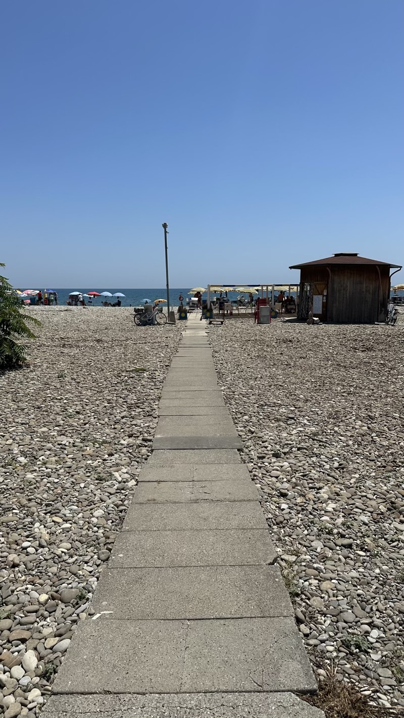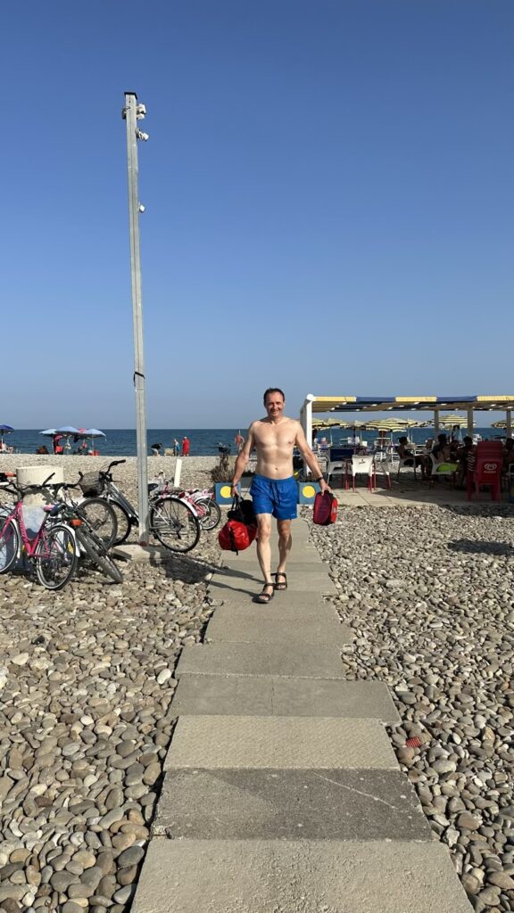 Danach schlendern wir zum Meer und mieten uns zwei Liegestühle mit Schirm um 15€ am Kiesstrand. Die Hitze ist extrem und wir verweilen bis ca. 18:00 Uhr abwechselnd im Schatten und im Wasser.